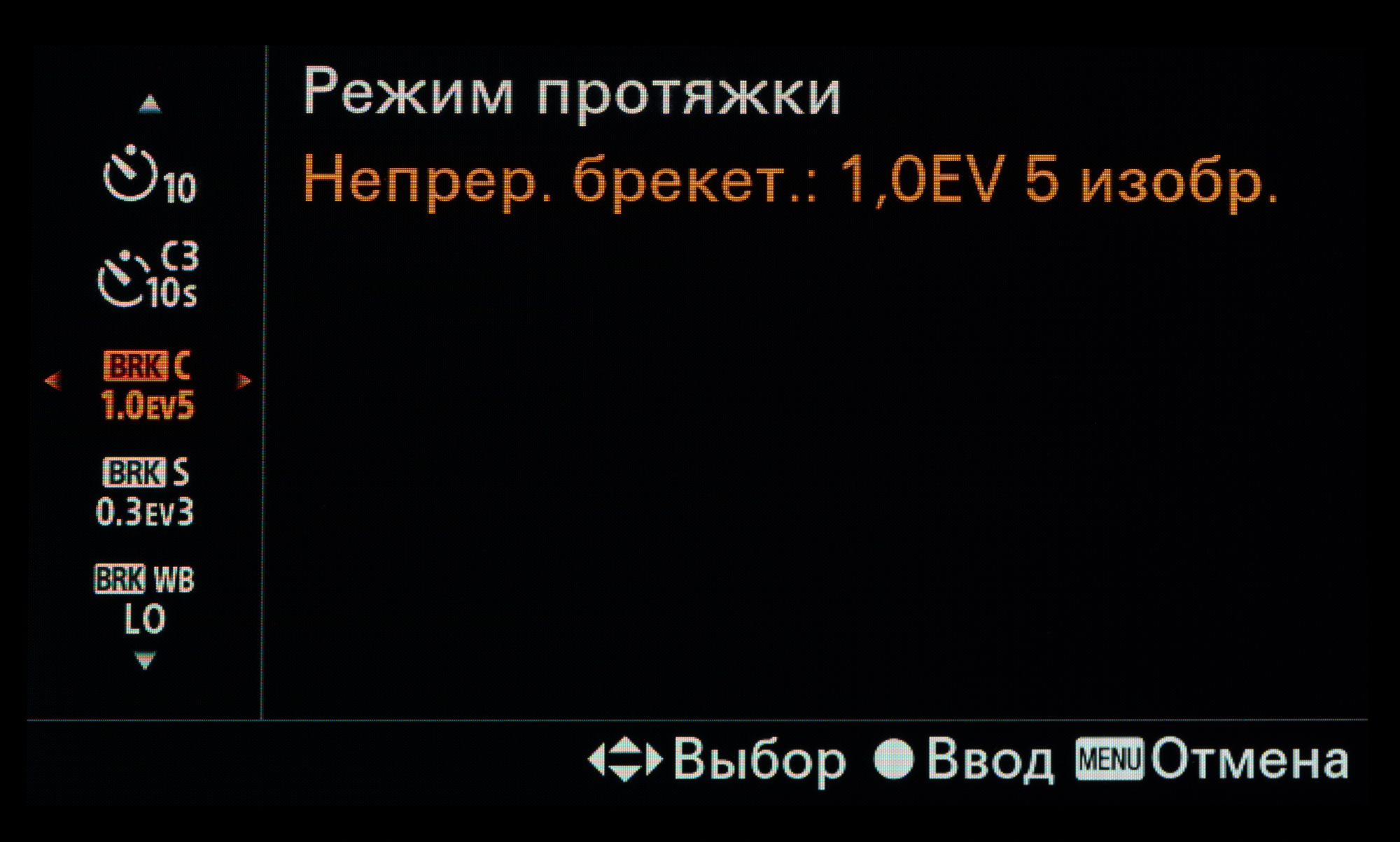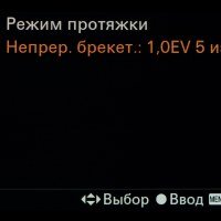 | Экспобрекетинг | непрерывный и покадровый по 3, 5, 9 кадров; при 3 и 5 кадрах — с шагом ⅓, ½, ⅔, 1, 2, 3 EV, при 9 кадрах — ⅓, ½, ⅔, 1 EV |