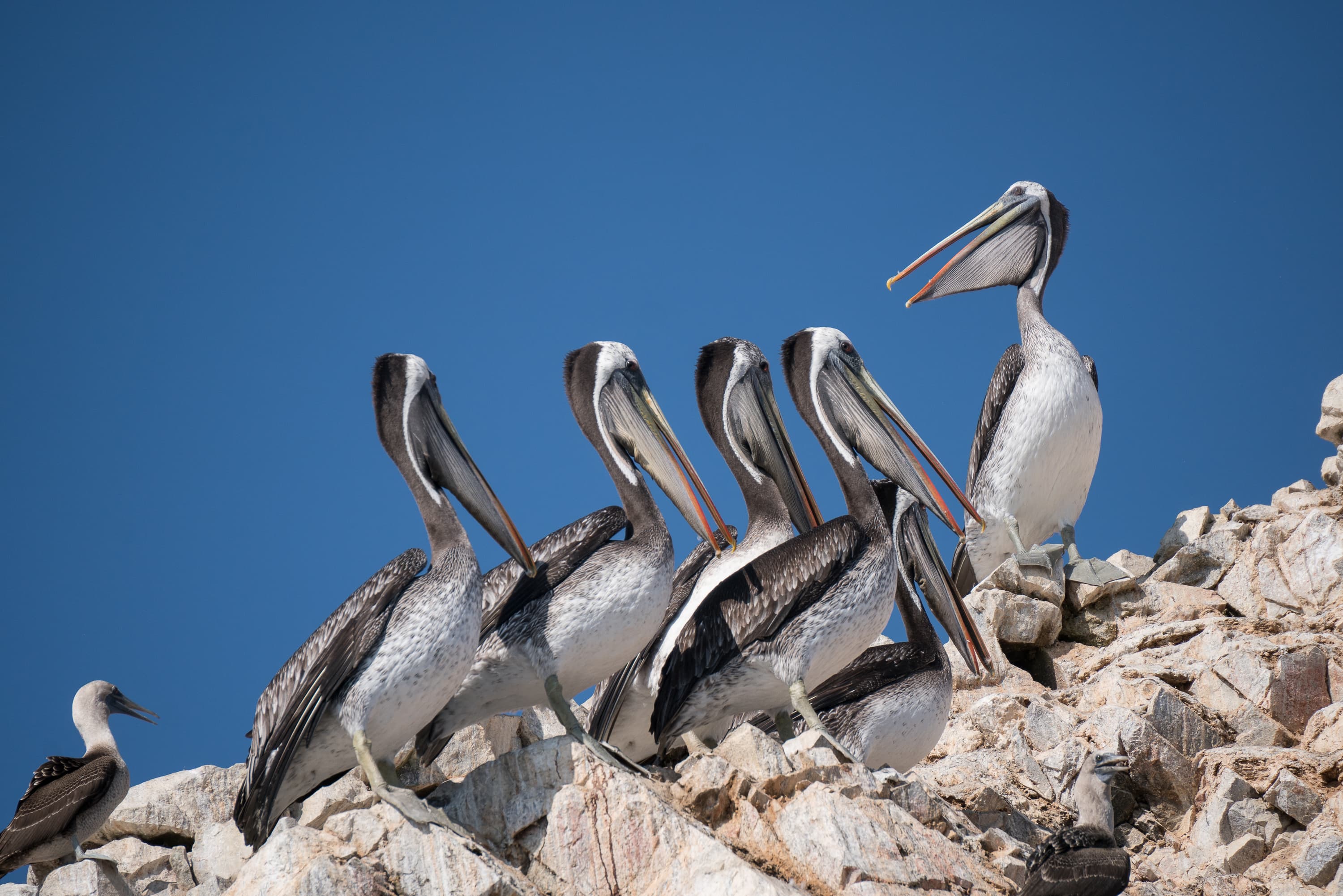 На практике это означает, что доверять следящей системе можно лишь с серьезными оговорками. Поэтому я в подавляющем большинстве ситуаций использую не непрерывную АФ, а однократную, с раздельным наведением на объект перед каждым спуском затвора. В таком режиме результаты намного стабильнее. Вот как это было использовано при съемке пеликанов на островах Байестас в национальном заповеднике округа Паракас, Перу, в апреле 2016 г. (везде ISO 100).