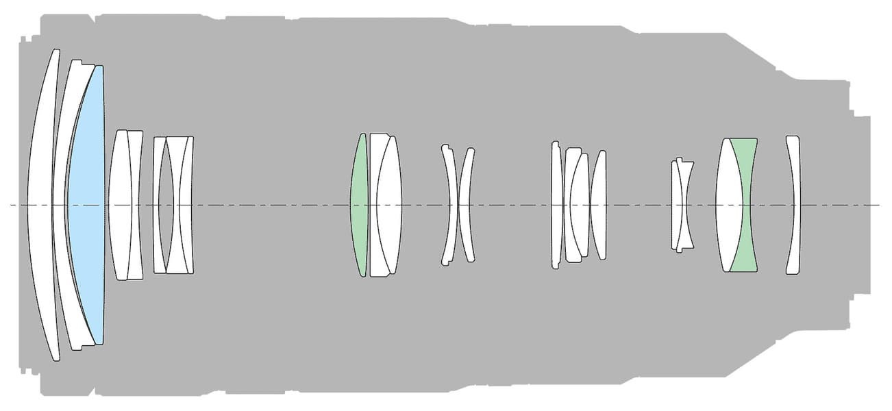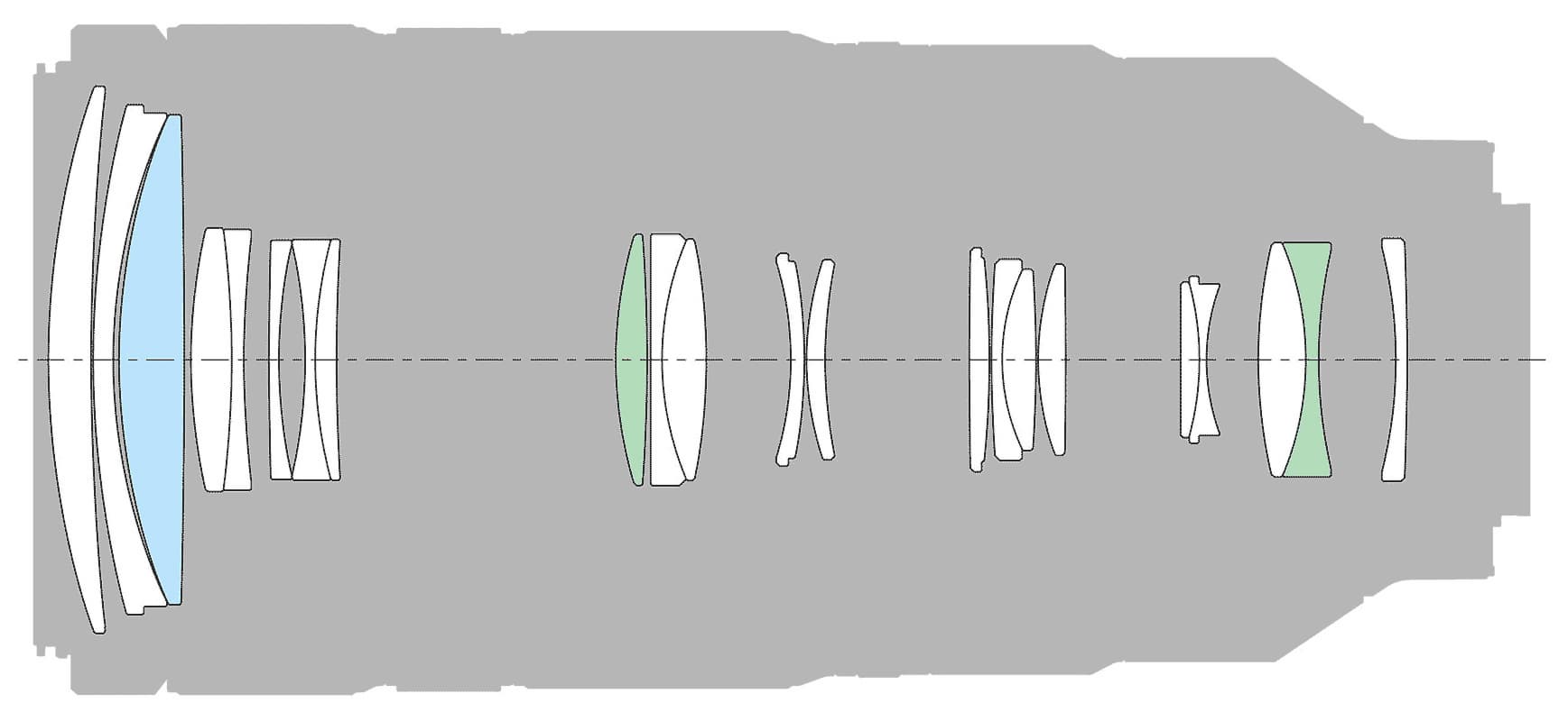 | Оптическая схема | 22 линзы в 16 группах, включая 2 элемента из низкодисперсионного стекла (ED) и один элемент со сверхнизкой дисперсией (Super ED) |