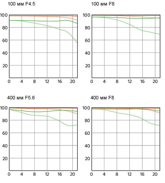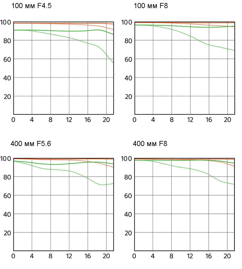 Картина MTF при минимальном и максимальном фокусном расстоянии достаточно привлекательная.