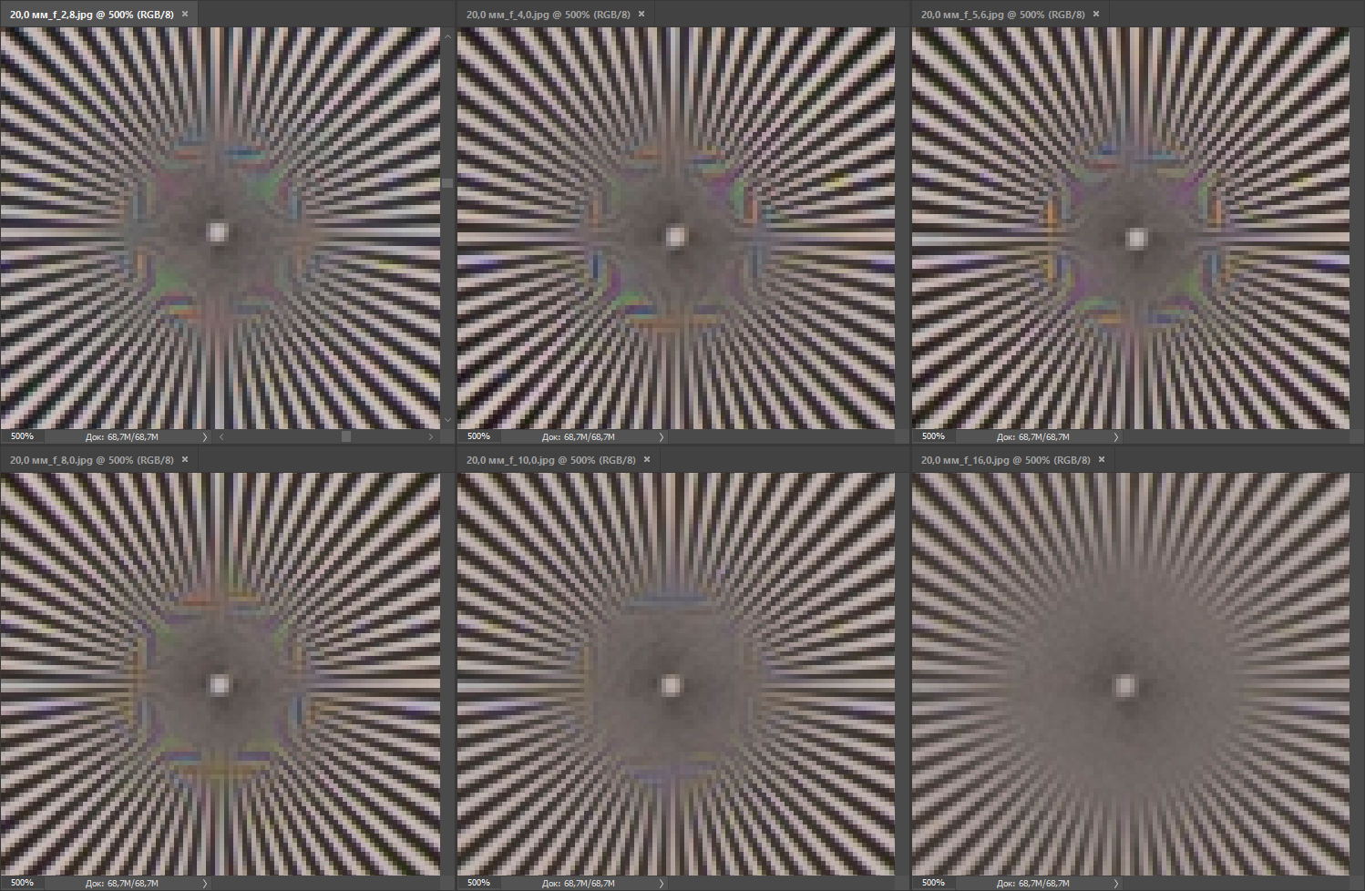 Исследуем, как ведет себя резкость в центре и на периферии кадра при разных ФР и значениях диафрагмы.
