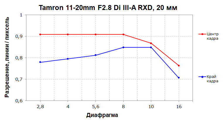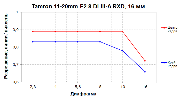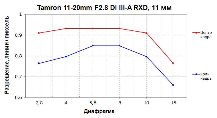 Разрешающая способность очень высокая и стабильная практически во всем диапазоне диафрагмирования, особенно в центре кадра. Разброс по полю кадра в среднем составляет около 10%, но из-за высоких абсолютных значений разрешающей способности он не критичен.