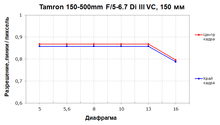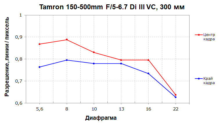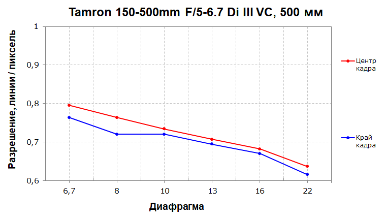 При максимальном зумировании разрешающая способность понижается до 78% в центре и на краю при полном раскрытии. Дальнейшее диафрагмирование приводит к еще большему падению разрешения. В итоге реально рабочим на 500 мм можно назвать небольшой диапазон F6,7—F10.
