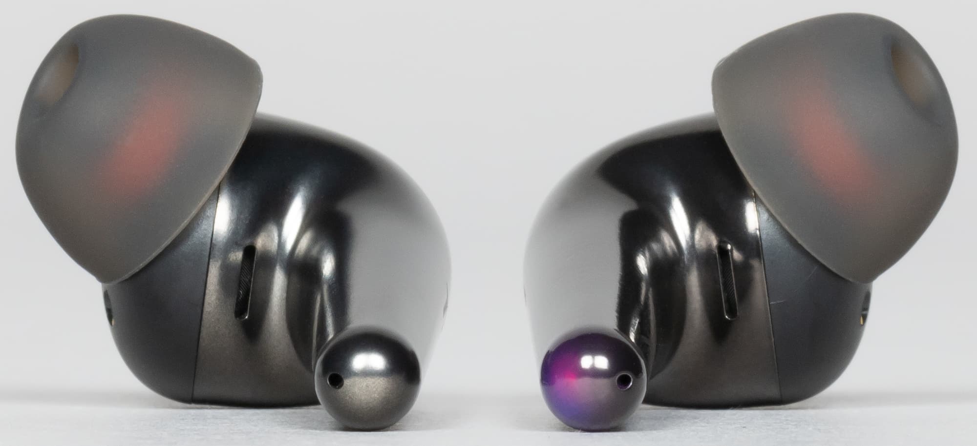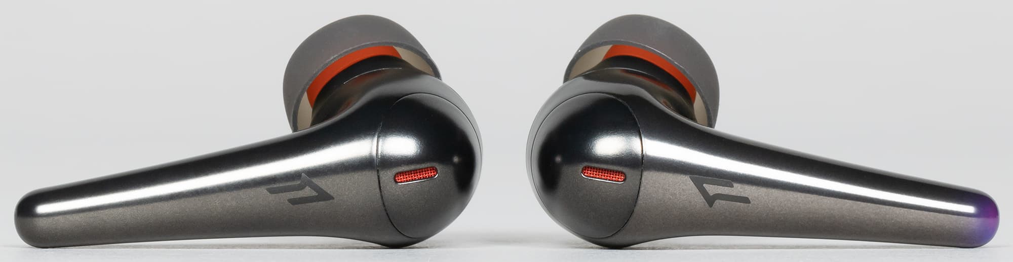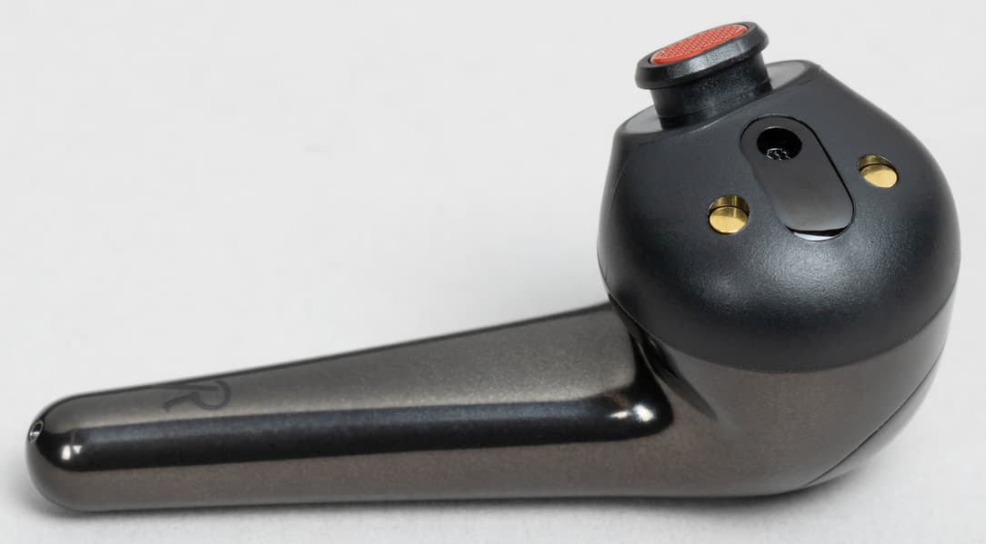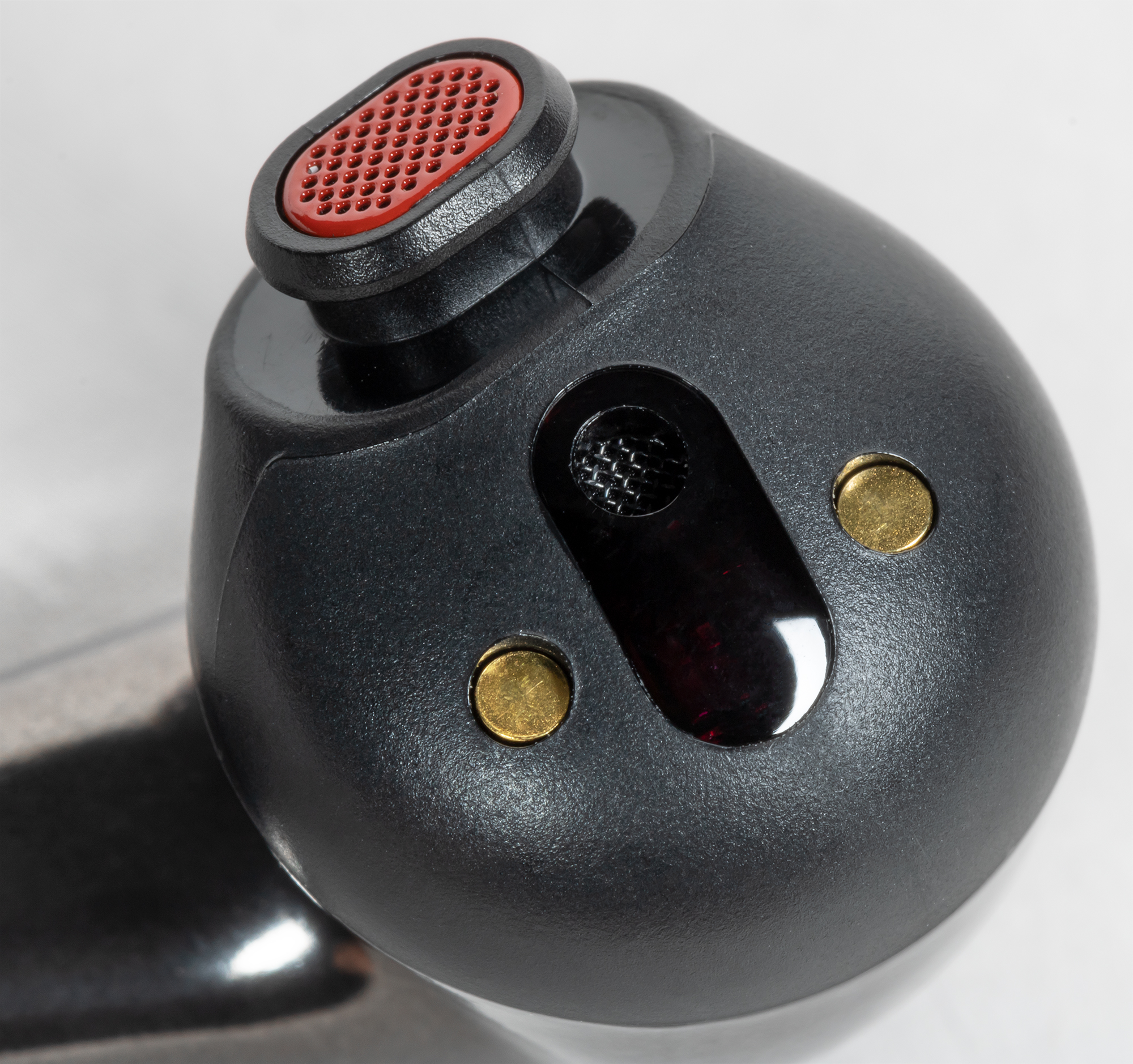 В нижней части округлого элемента каждого наушника размещено отверстие микрофона, плюс еще одно отверстие мы видим в торце «палочки». Можно было бы предположить, что оно тоже для микрофона, но вероятнее оно является компенсирующим и служит для сброса лишнего давления во время работы динамка.