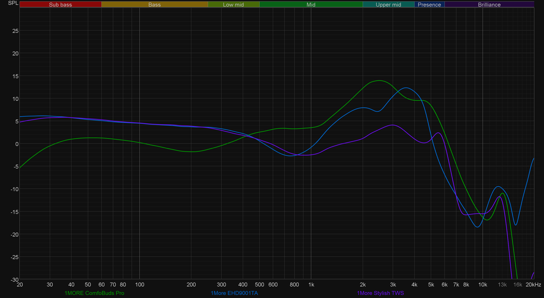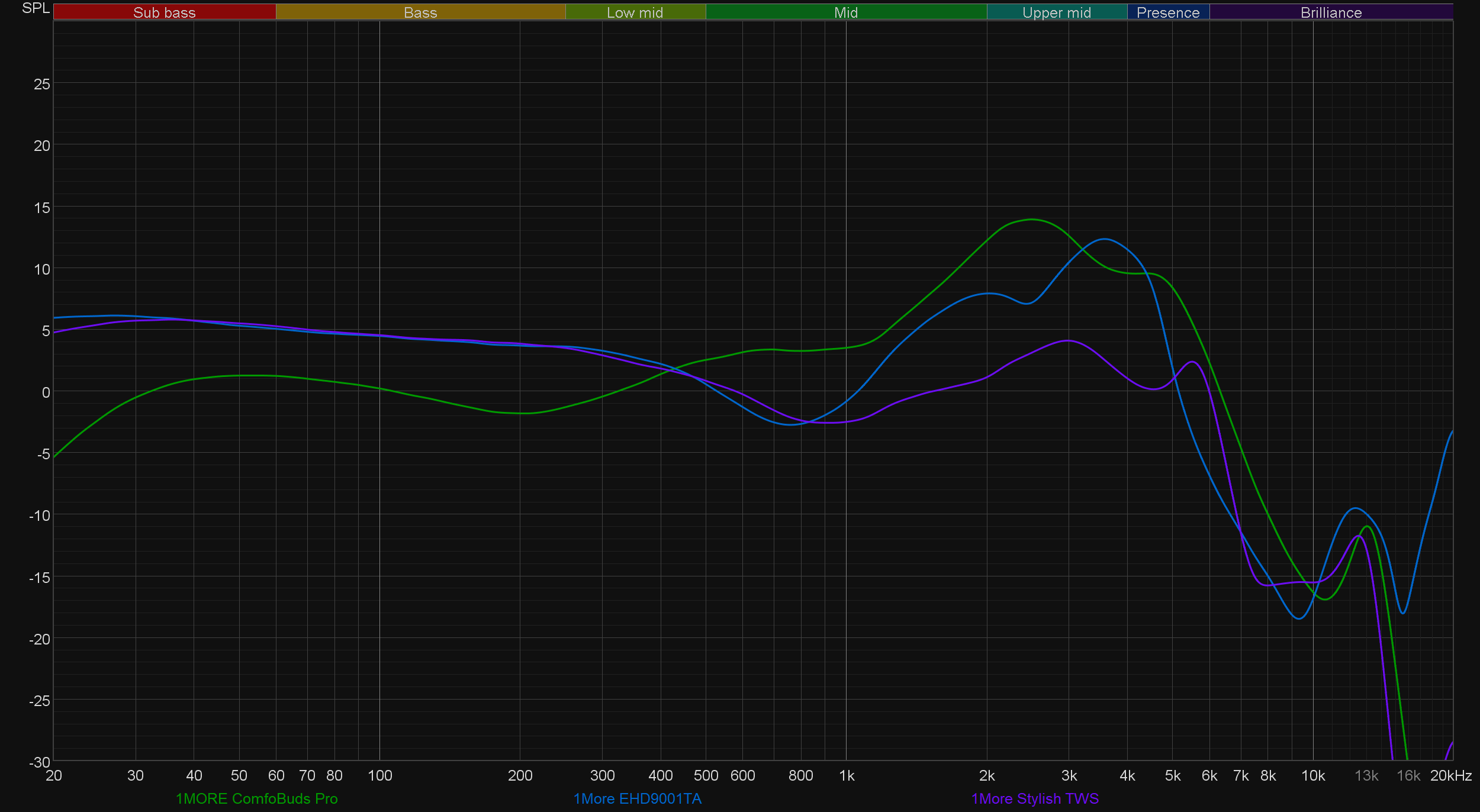 Как и всегда, не очень хорошо влияет: тут уж всегда приходится выбирать между «провалами» в НЧ-регистре и эффективностью подавления шумов. Надо отметить, что для своего качества работы «шумодав» в 1More ComfoBuds Pro обходится со звуком вполне гуманно. Ну и под конец сравним графики тестируемой гарнитуры и пары других продуктов 1More — без всяких выводов, просто ради интереса.