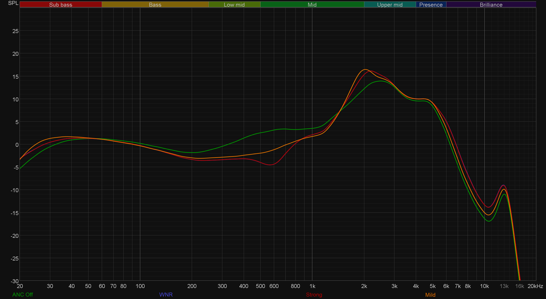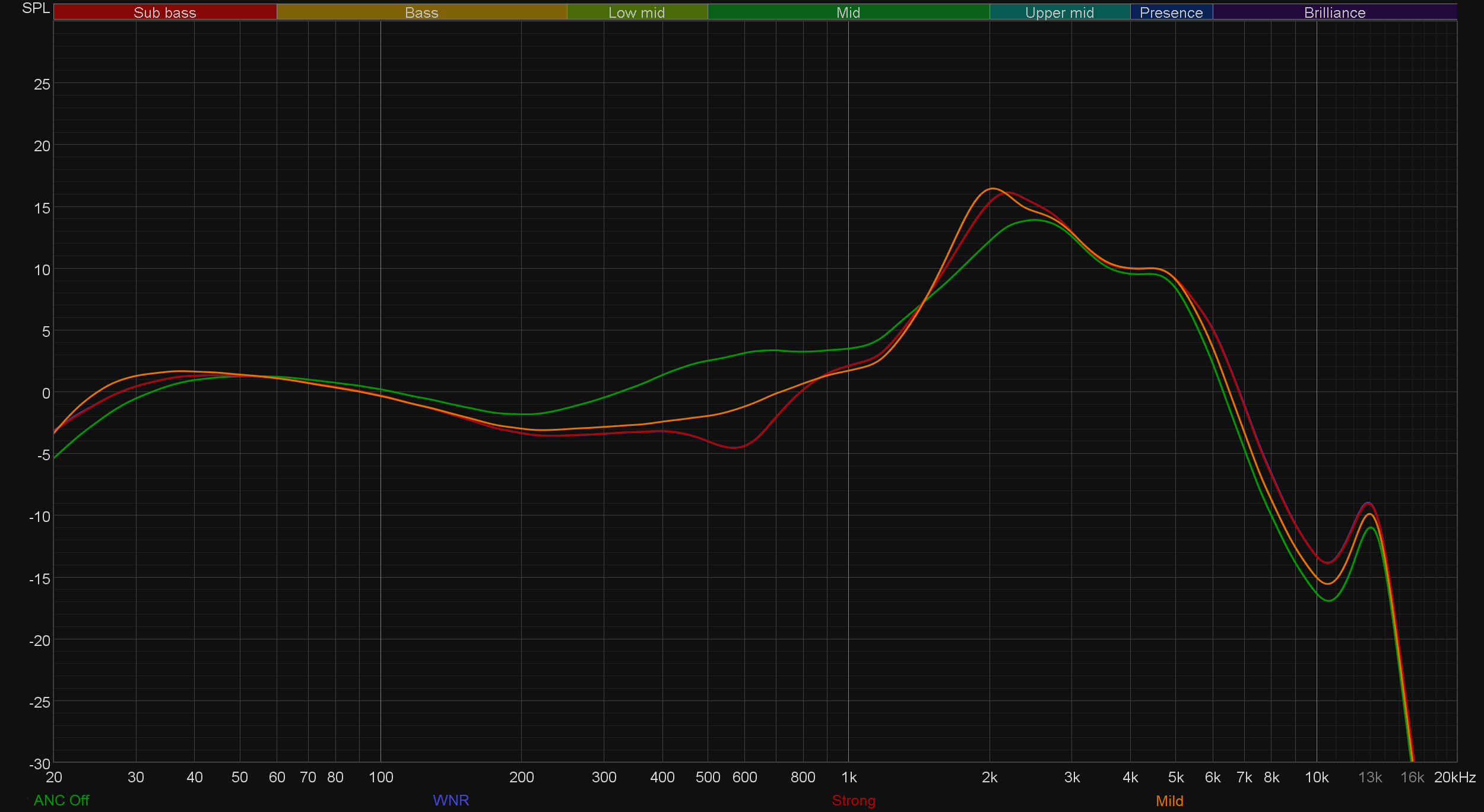 В таком виде все еще нагляднее. Небольшой «горбик» в районе 40-50 Гц дает нам ту самую «плотность» баса, ну а акцент на 5 кГц отвечает за ощущение «ясности и яркости». Видно, что авторы ставили целью сделать звучание комфортным и приятным. По нашему мнению, им это вполне удалось. Осталось посмотреть, как влияет на звук включение системы активного шумоподавления.