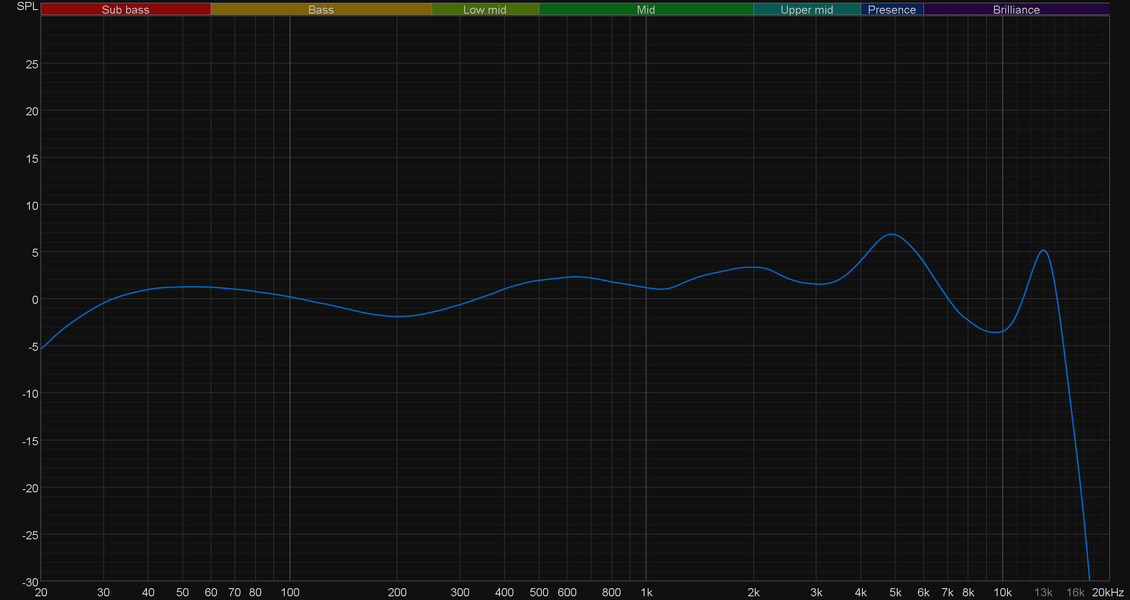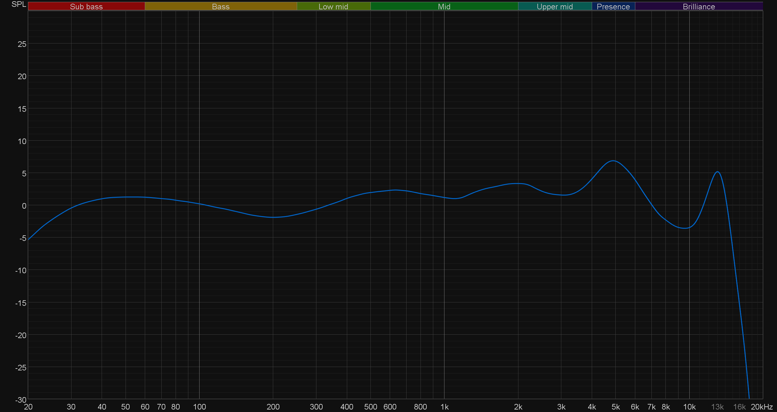 График АЧХ выше показан на фоне кривой IDF (IEM diffuse field compensation), предоставленной производителем используемого стенда. Ее задача — помочь скомпенсировать резонансные явления в имитированном слуховом канале и особенности используемого оборудования, создав «звуковой профиль», максимально корректно иллюстрирующий то, как звучание наушников воспринимается слушателем. Ее можно рассматривать как адаптированный под конкретное устройство аналог так называемой «кривой Хармана», созданной командой Harman International под руководством доктора Шона Олива. Скомпенсируем полученный график АЧХ в соответствии с кривой IDF.
