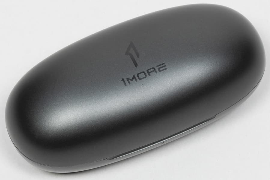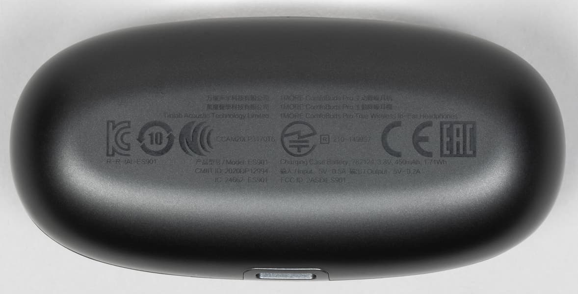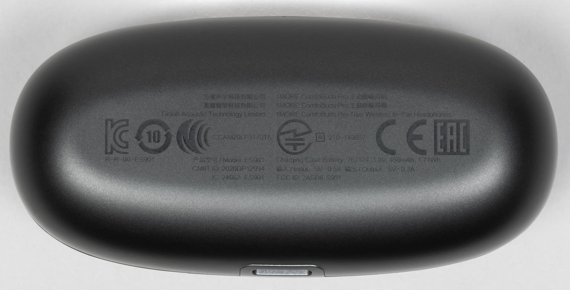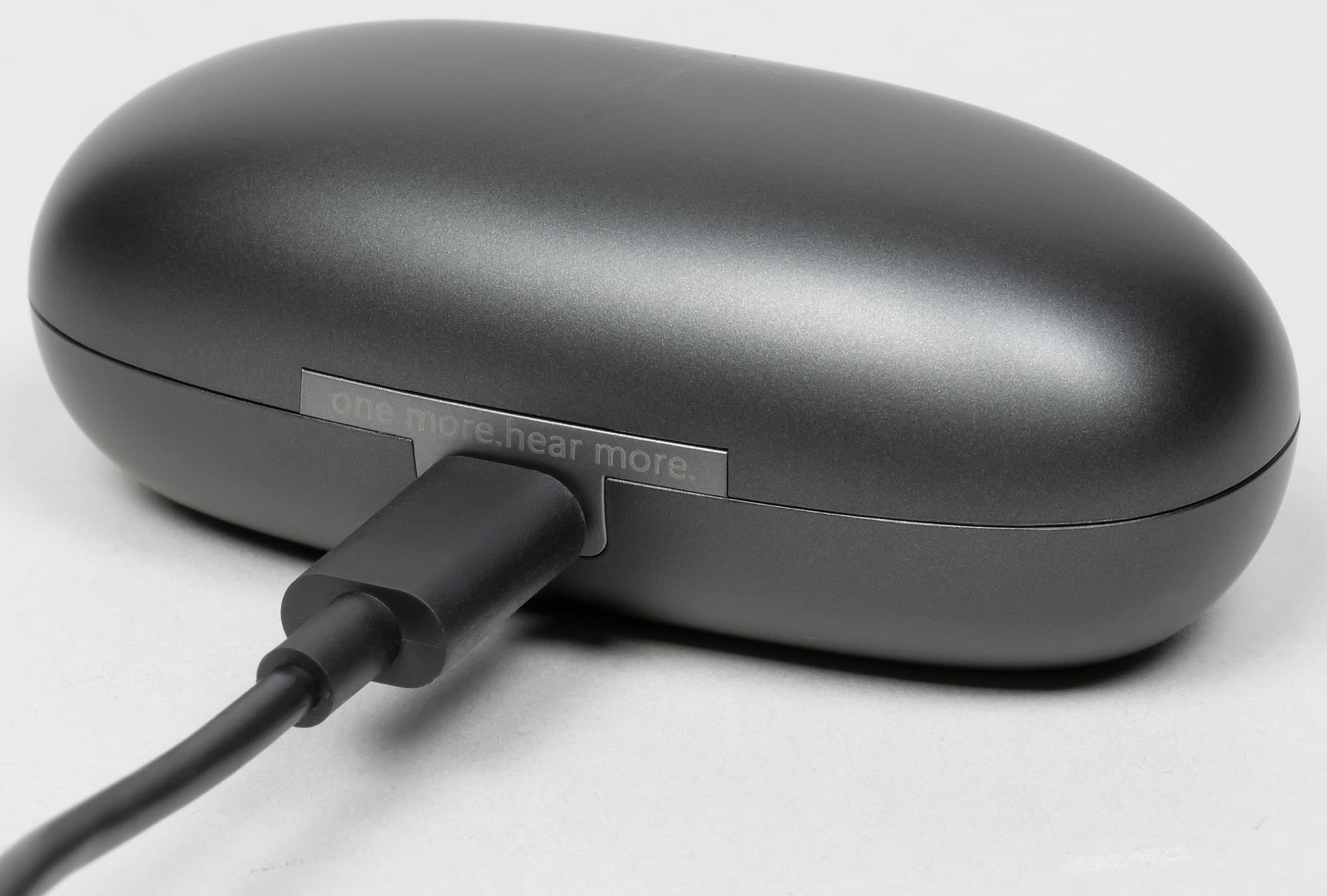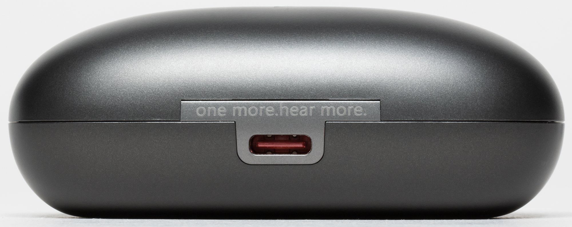 На задней панели находится порт USB Type C для зарядки, внутренняя часть которого выделена красным цветом. Небольшие вкрапления красного — одна из «фишек» дизайна 1More ComfoBuds Pro. Выше порта на петле для открытия крышки размещен слоган «One more. Hear more».