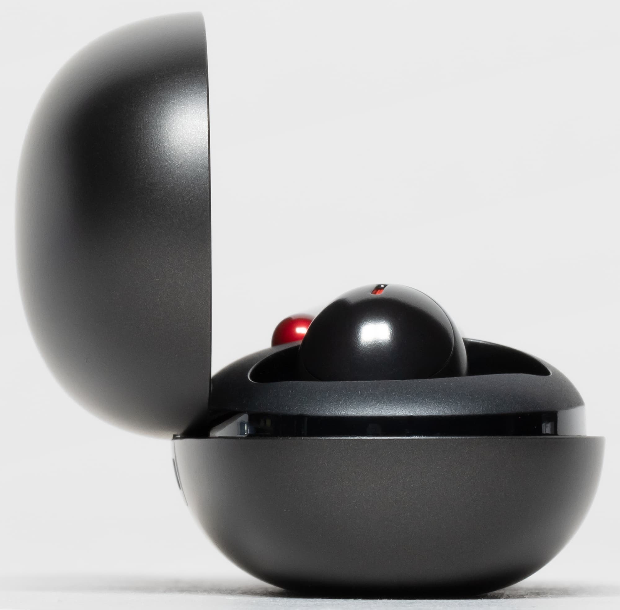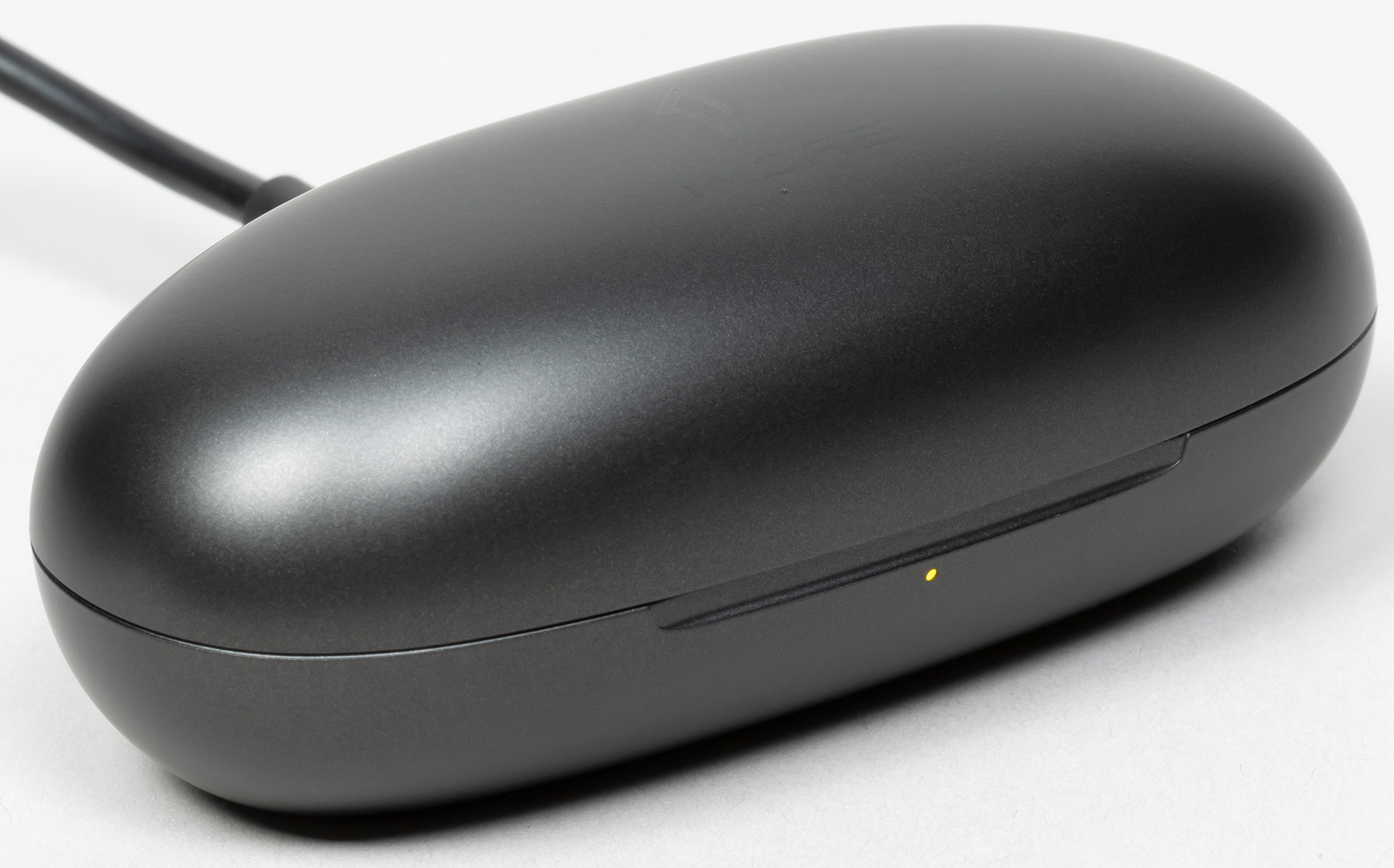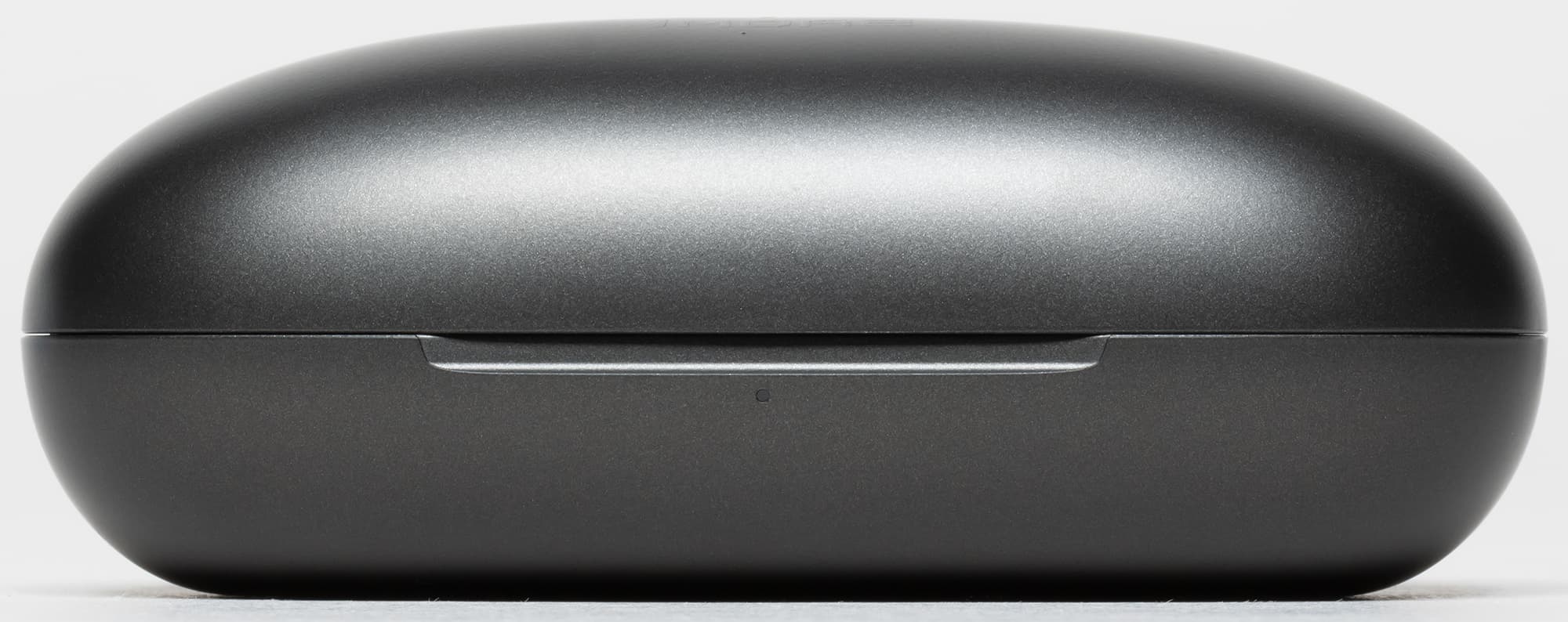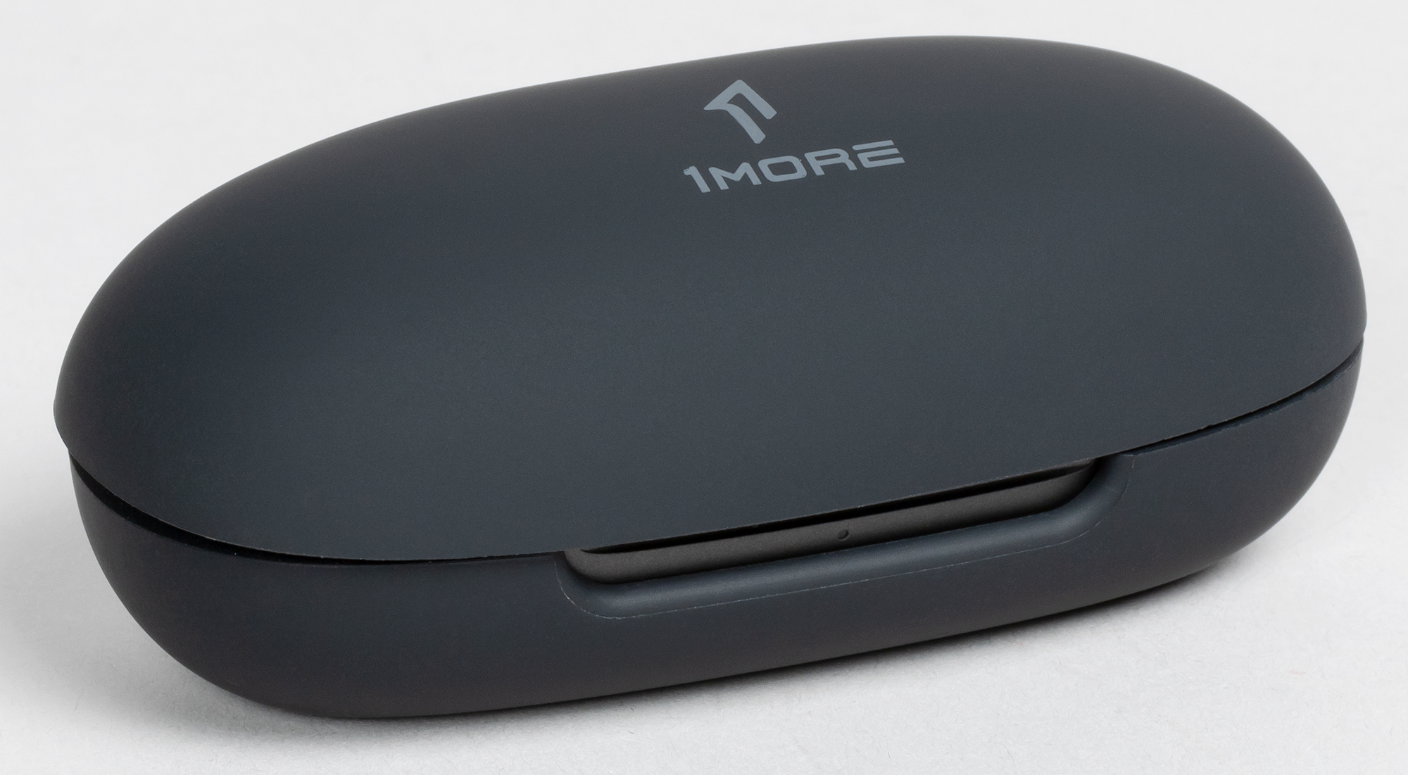 На задней панели находится порт USB Type C для зарядки, внутренняя часть которого выделена красным цветом. Небольшие вкрапления красного — одна из «фишек» дизайна 1More ComfoBuds Pro. Выше порта на петле для открытия крышки размещен слоган «One more. Hear more».