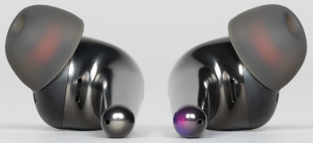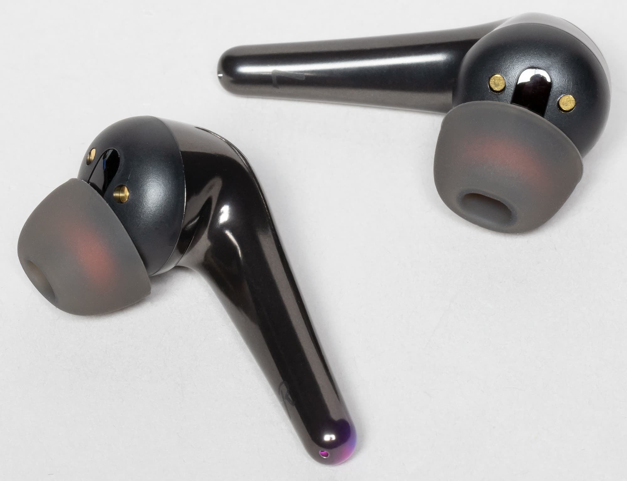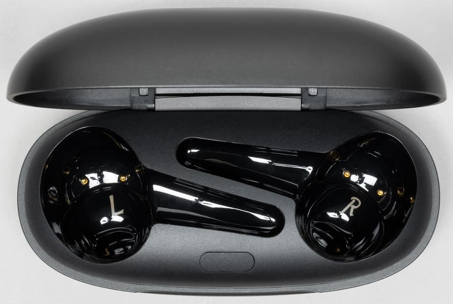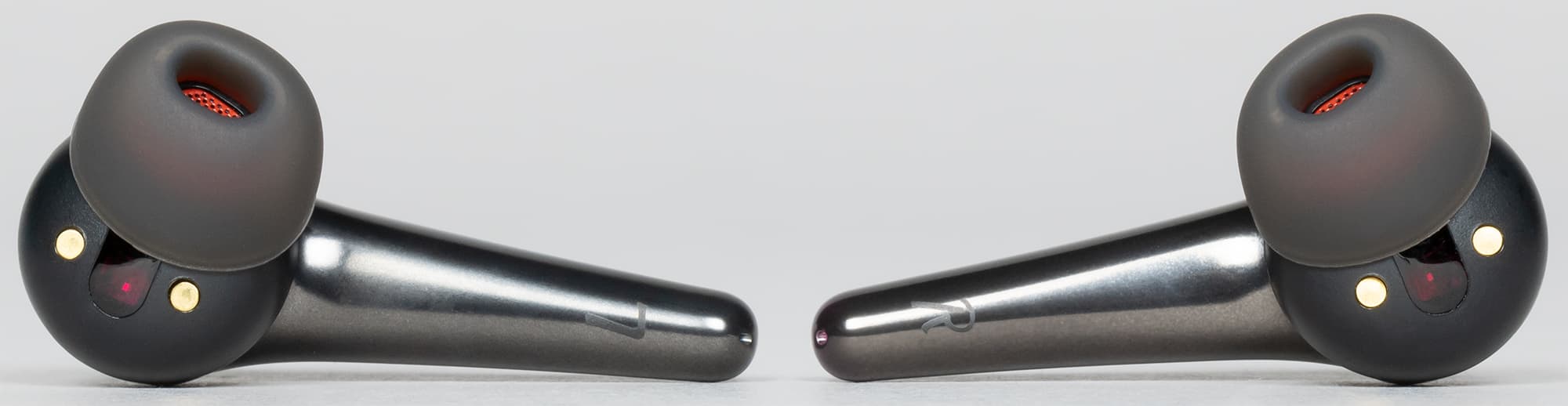 На внутренней стороне округлой части корпуса видны контакты для зарядки и окошки инфракрасных датчиков ношения. На основания «ножек» нанесены обозначения правого и левого наушников.