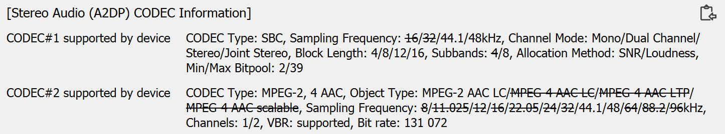 Любой из наушников может работать в монорежиме — достаточно просто убрать другой в кейс. Один из них, по всей видимости, используется в качестве «ведущего» и служит для подключения к источнику, если отключить его — гарнитуре понадобится немного времени на переподключение, возникнет пауза в воспроизведении. Поддержки мультипойнта нет. После подключения к ПК мы традиционно получили список поддерживаемых кодеков и их режимов с помощью утилиты Bluetooth Tweaker.