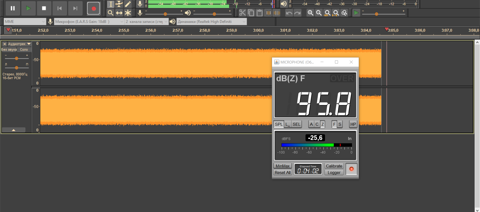 Безопасным уровнем звукового давления при прослушивании музыки в наушниках считается 75 дБ, но на практике большинство слушателей предпочитает уровень 90-100 дБ. Мы транслируем в наушники белый шум, фиксируя уровень SPL в районе 95 дБ, сразу после старта воспроизведения запускаем запись сигнала с измерительного стенда — по длине получившегося трека легко понять, сколько проработал каждый из наушников.
