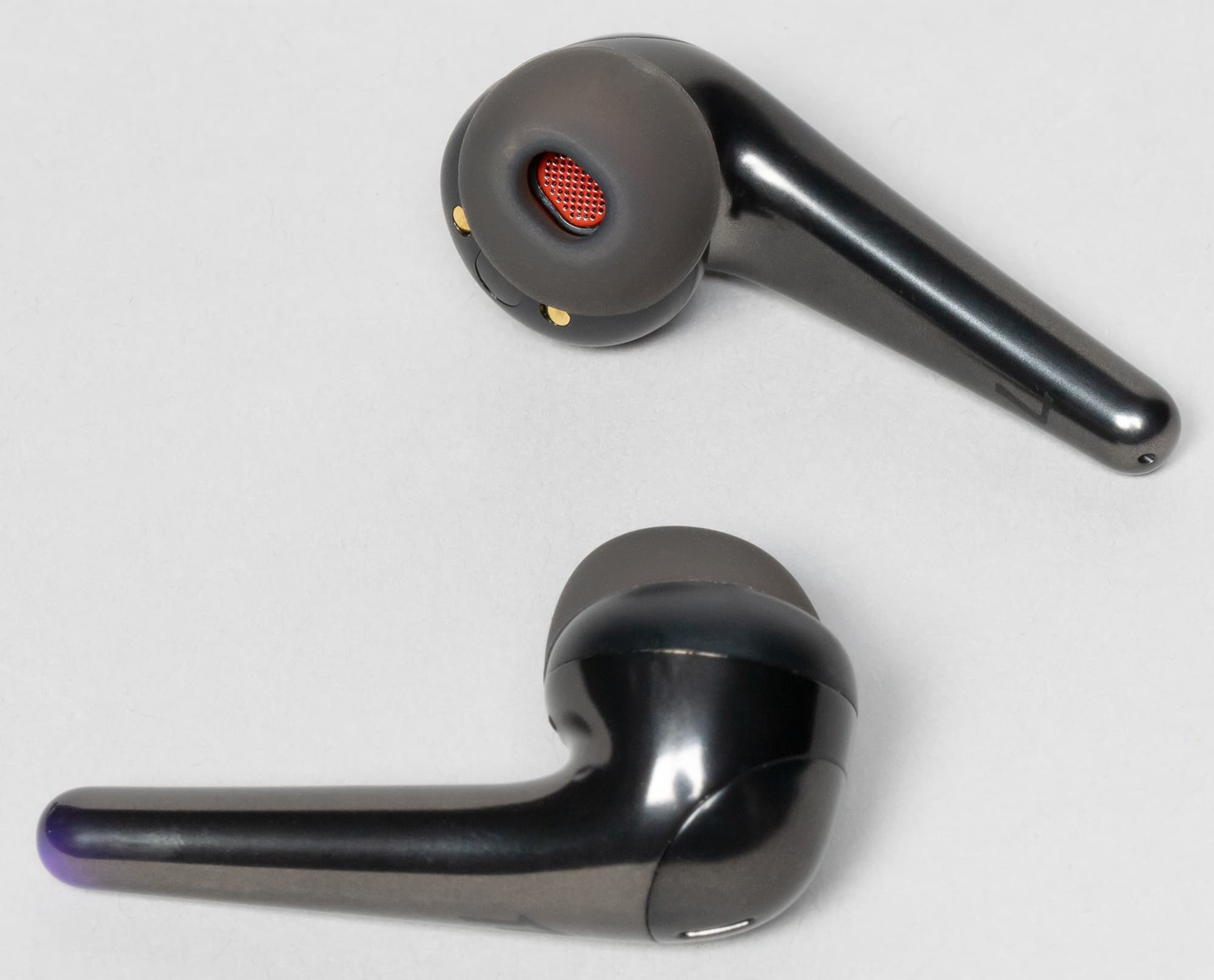 Наушники выполнены из глянцевого пластика, про светодиодные индикаторы в нижней части палочек мы уже упоминали. В ярком студийном свете они выглядят скромно, в жизни же смотрятся очень эффектно.