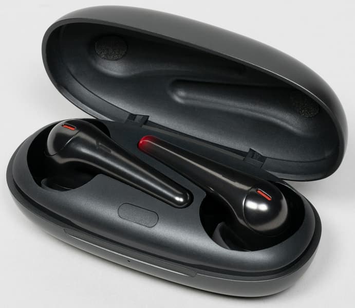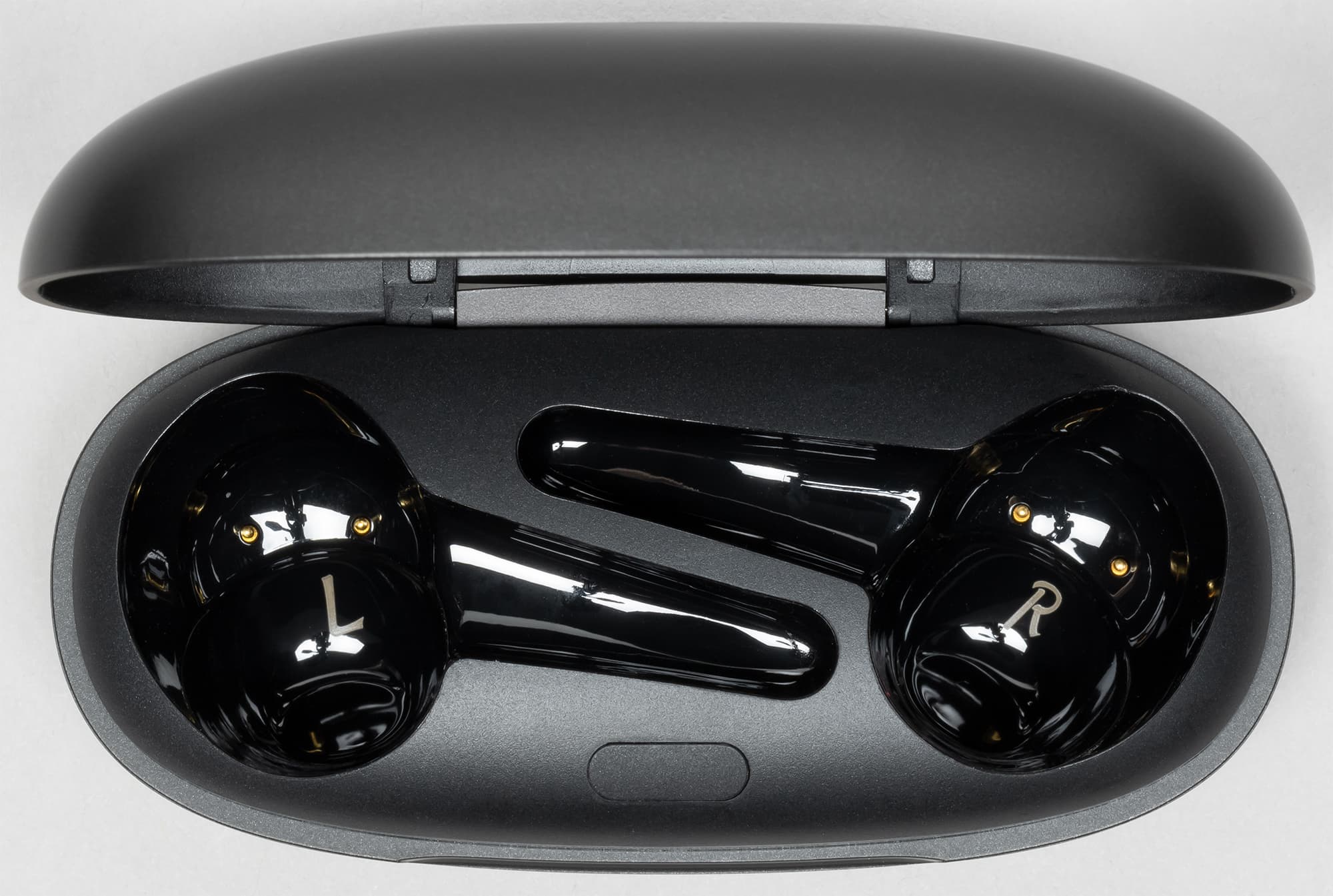 Слоты глянцевые, внутри видны подпружиненные контакты для зарядки и обозначения «правый»/«левый». Перед ними размещена небольшая кнопка, при долгом нажатии принудительно запускающая процесс Bluetooth-сопряжения ComfoBuds Pro с новым устройством.