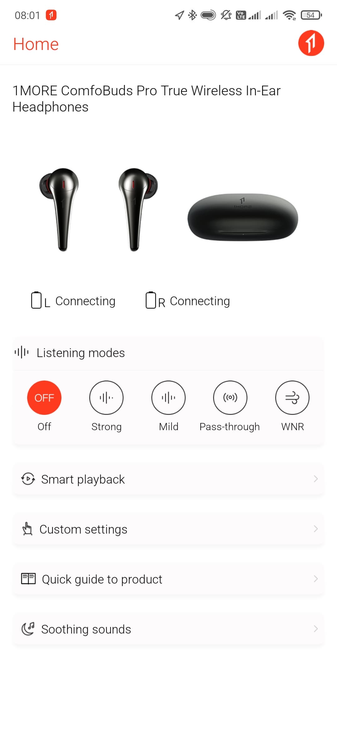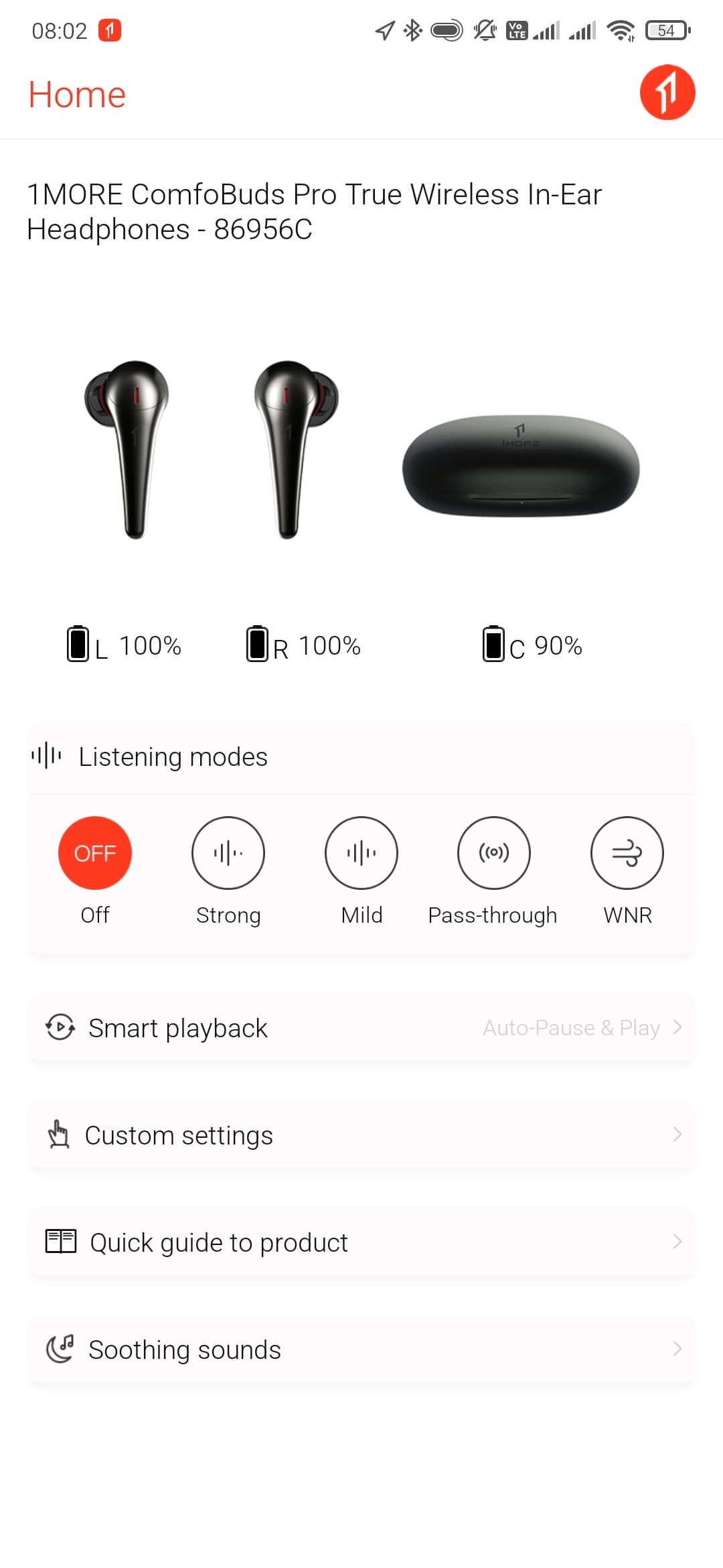 Устанавливаем ПО, даем необходимые для работы разрешения. Гарнитуру, как уже упоминалось выше, сопрягаем заранее. После запуска приложение пару секунд тратит на подключение, после чего на главном экране можно увидеть зарядку обоих наушников и кейса, причем всех по отдельности. Ну а ниже расположено меню, в верхней части которого находится переключатель режимов работы шумоподавления и «режима прозрачности».