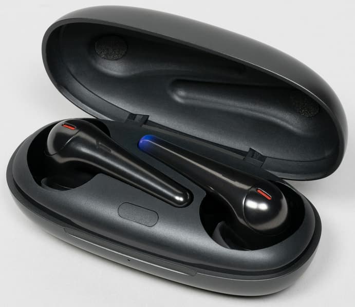При открытии крышки гарнитура сразу пытается наладить связь с источником, о чем оповещает с помощью индикаторов, мигающих синим и красным цветом. Светодиоды при этом расположены в полупрозрачном корпусе «палочек» наушников из-за чего смотрится все это одновременно красиво и очень оригинально.