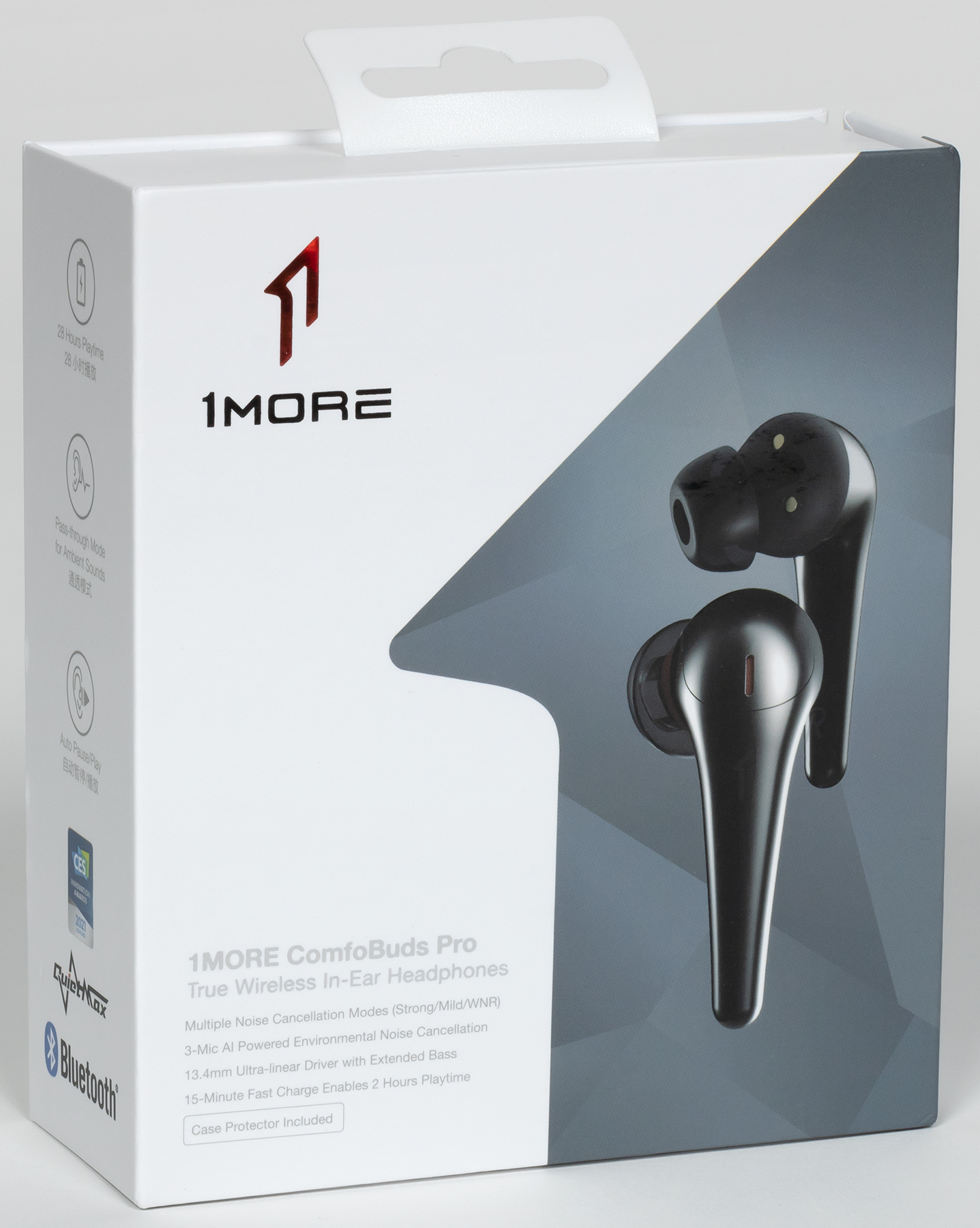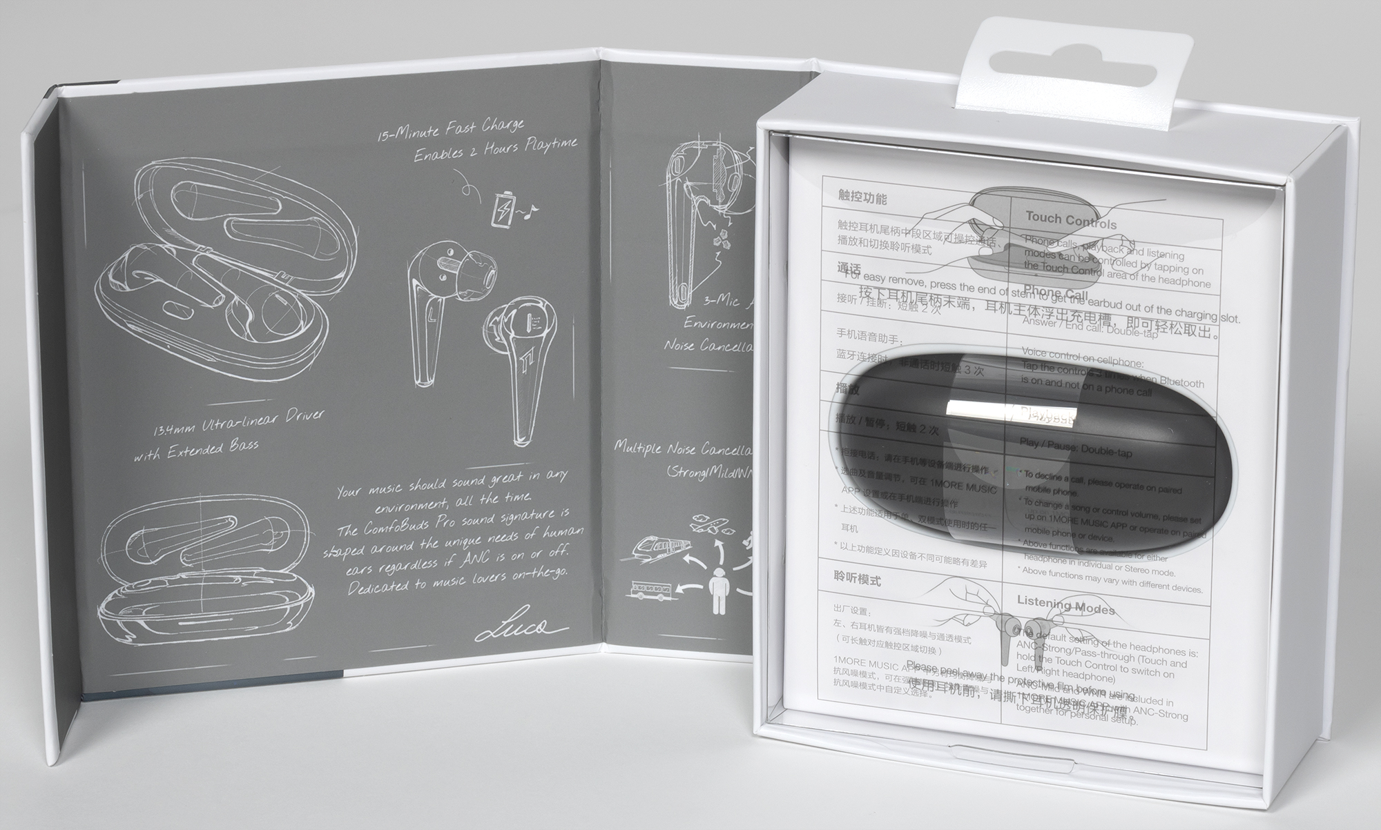 Упаковка продуктов 1More зачастую выглядит лучше, чем у многих из попадавших нам в руки «премиальных» решений. ComfoBuds Pro в этом отношении не стали исключением. Поставляются они в картонной коробке с магнитной крышкой, которая откидывается влево.