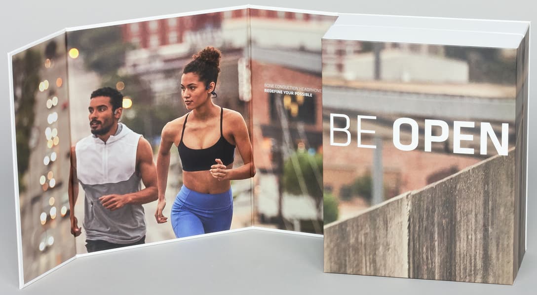 Сняв верхнюю часть упаковки, пользователь обнаруживает «коробку-книжку» с откидной обложкой и раскрывающейся внутренней частью. На ее поверхностях также нанесены красочные иллюстрации, плюс слоган «Будь открытым». Внутри наушники закреплены с помощью пластикового ложемента.