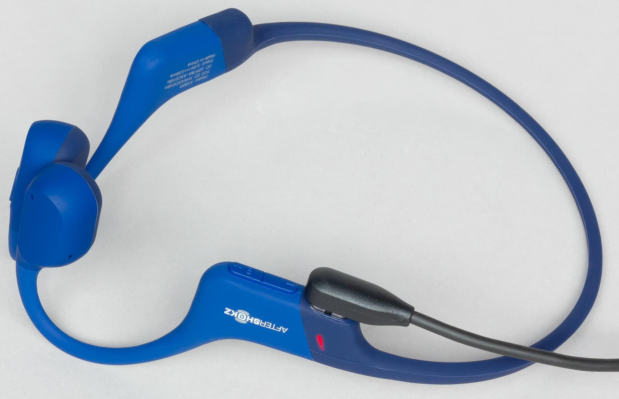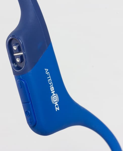 На нижней части правого из них можно найти разъем для подключения зарядного устройства, плюс кнопки управления громкостью, одна из которых также выполняет функцию включения и отключения устройства. На боковой поверхности перед надписью AfterShokz располагается светодиодный индикатор, практически незаметный в выключенном состоянии.