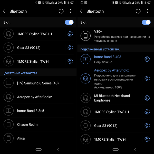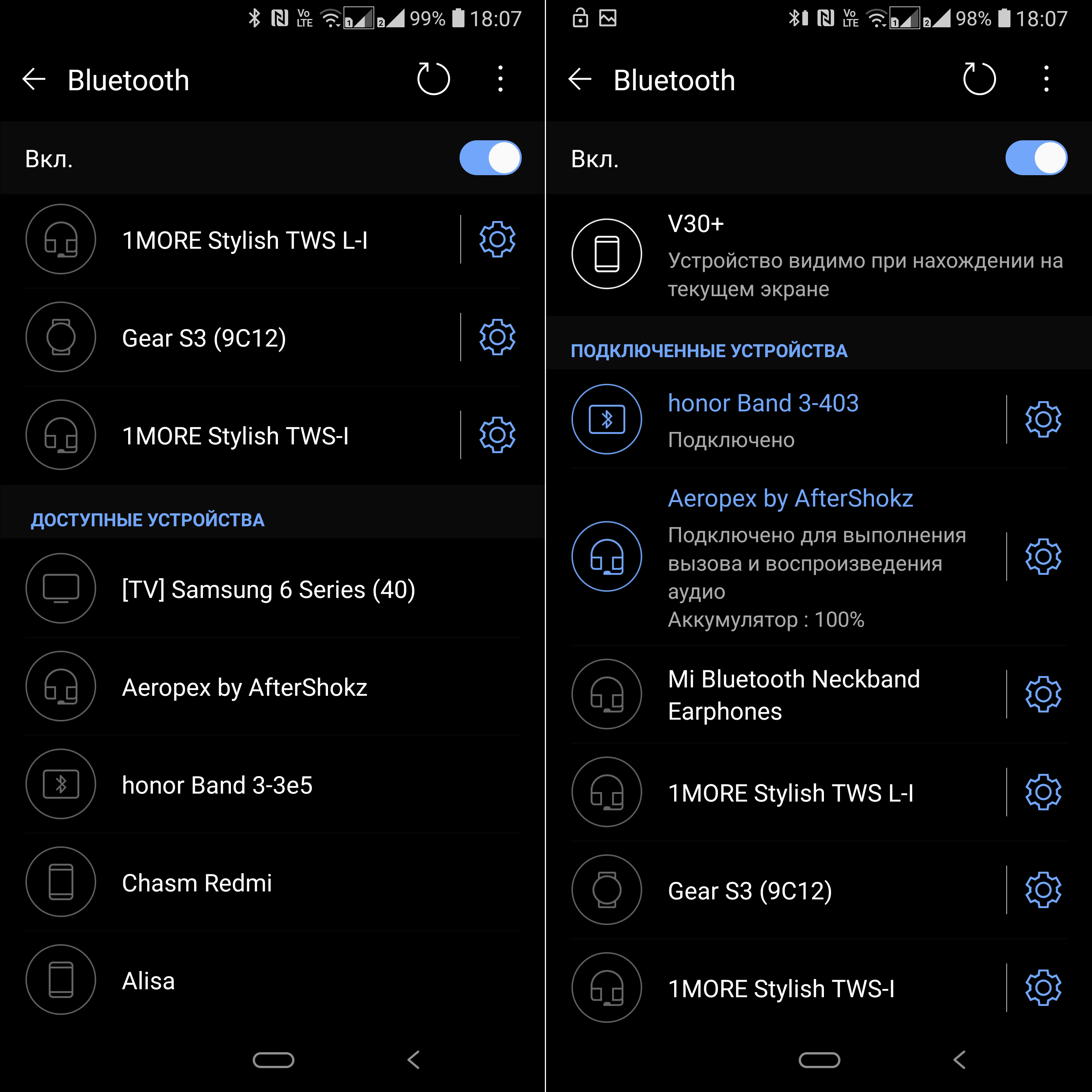Для активации режима сопряжения нужно удерживать кнопку питания (она же кнопка прибавления громкости) в течение чуть более 5 секунд. После этого индикатор начинает мигать синим и красным светом, остается найти гарнитуру в соответствующем меню гаджета и подключить без ввода пароля. Уровень заряда аккумулятора корректно транслируется на подключенное устройство — за его изменением можно наблюдать в онлайн-режиме.