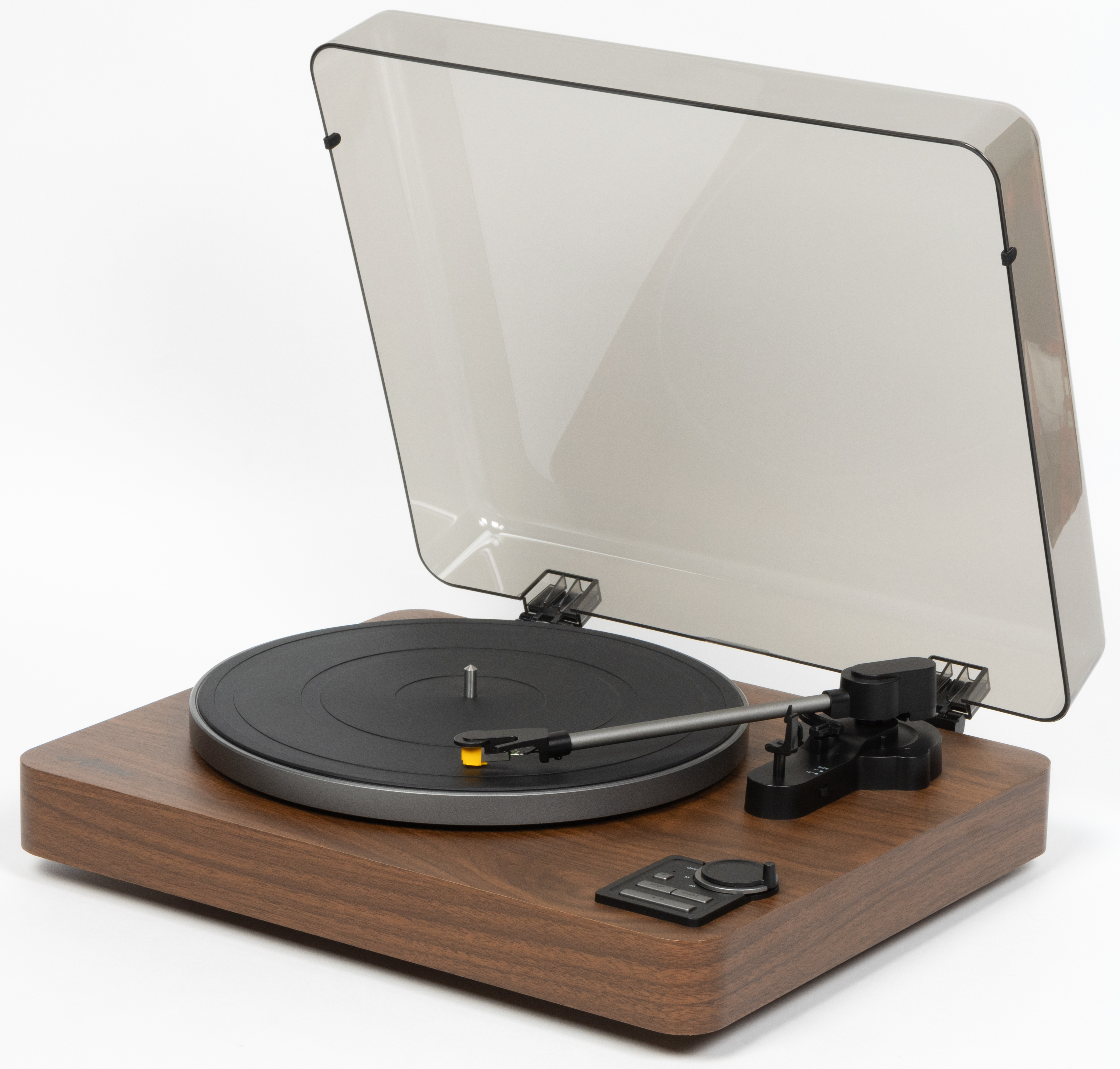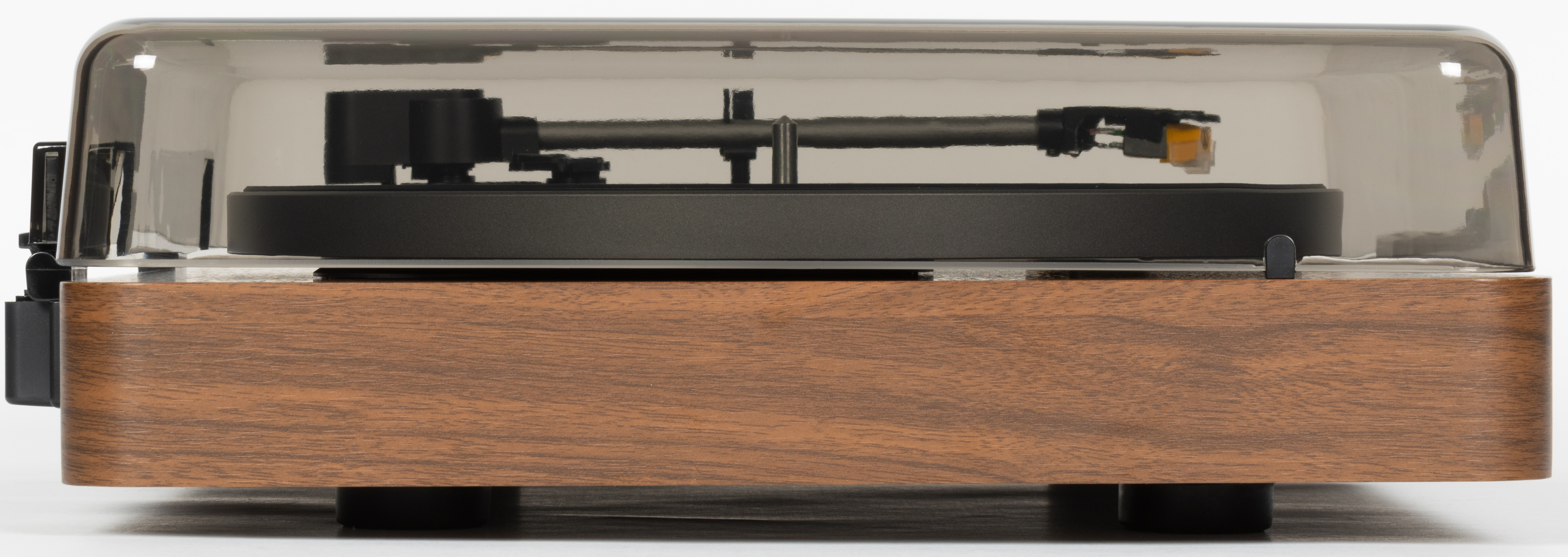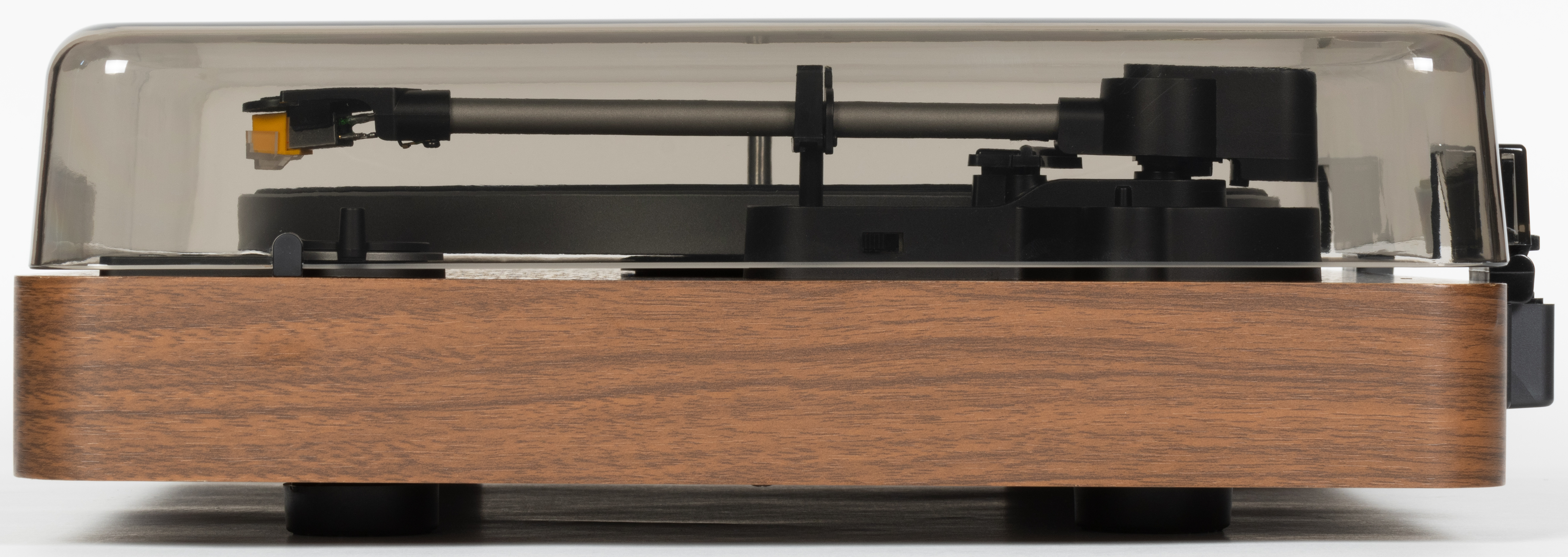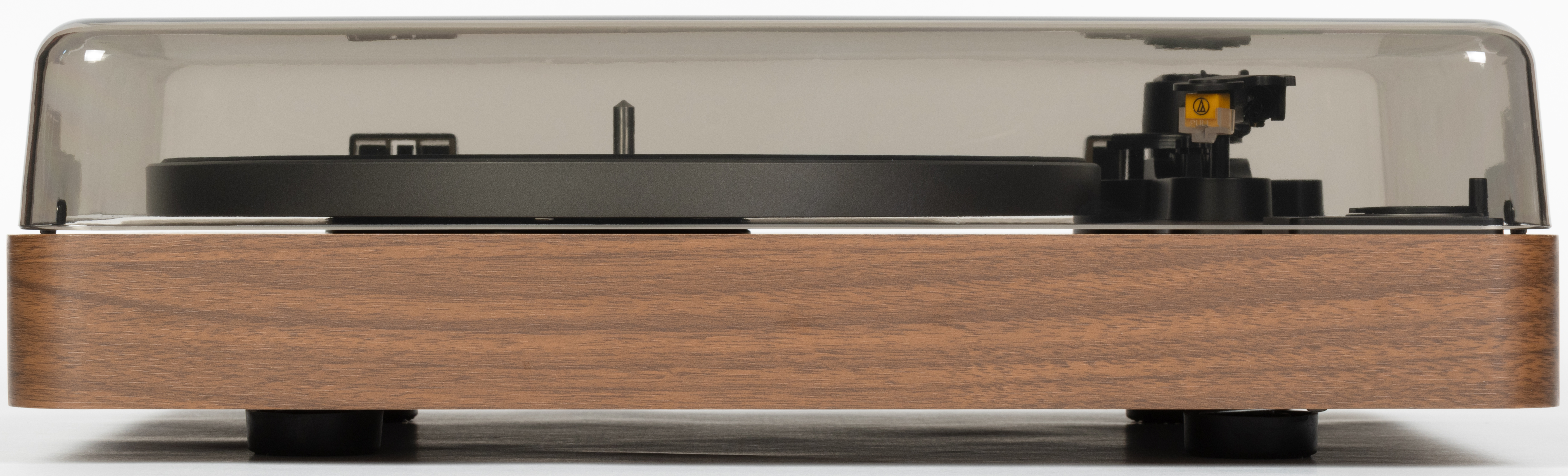С небольшого расстояния крышка кажется довольно темной, но на деле она почти прозрачная: при взгляде сверху отлично видны все элементы управления, тонарм и даже надписи на «яблоке» пластинки. При этом крышка является съемной и поставляется отдельно — при большом желании проигрыватель можно использовать и без нее, правда бороться с пылью станет основательно посложнее.