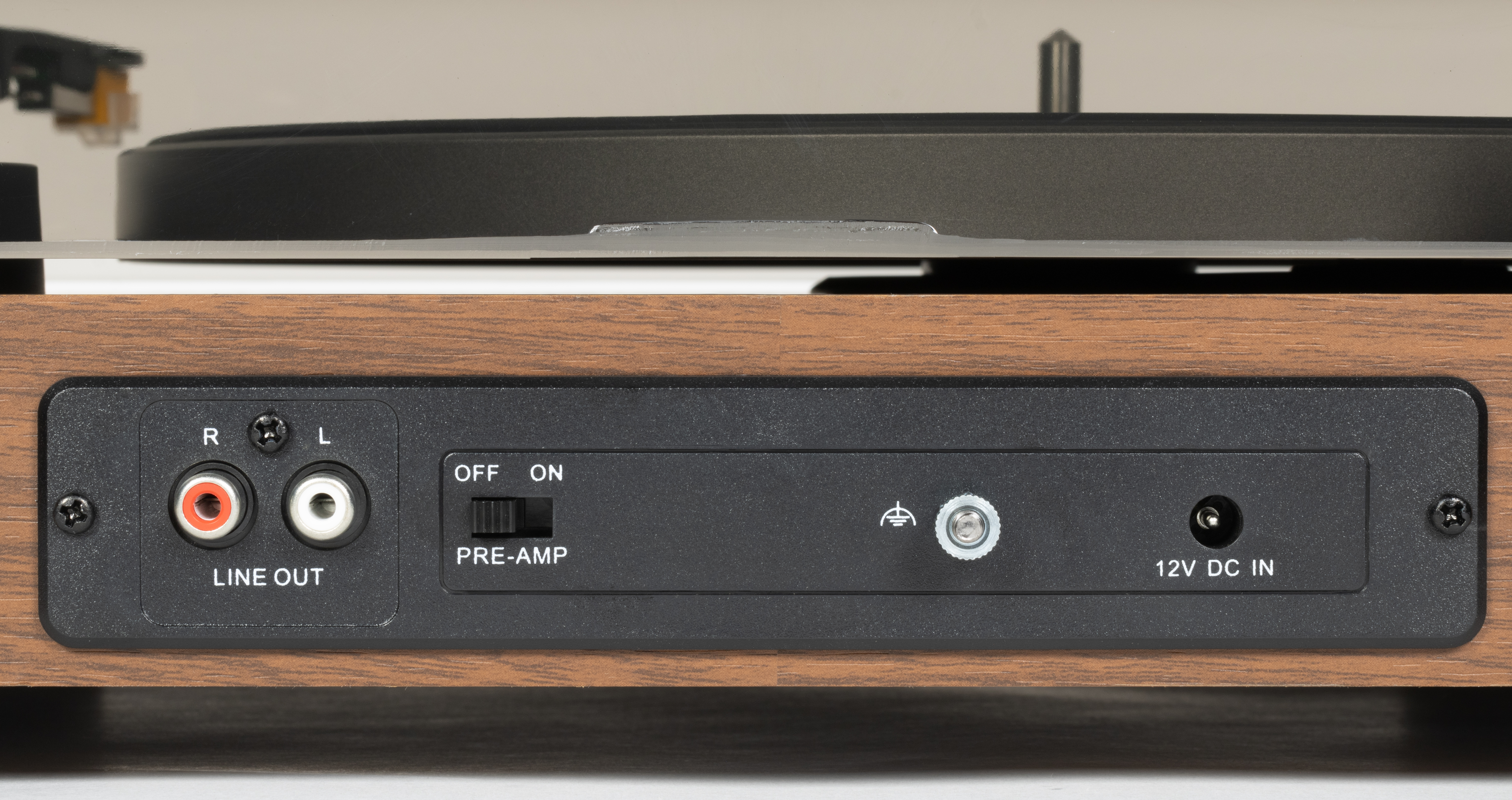 Режим выбирается в зависимости от того, подключаете ли вы проигрыватель напрямую к усилителю или используете внешний фонокорректор. Переключатель для выбора режима расположен чуть правее. Рядом — клемма заземления, которая пригодится при подключении к фонокорректору. И, наконец, в правой части панели находится круглый разъем питания.