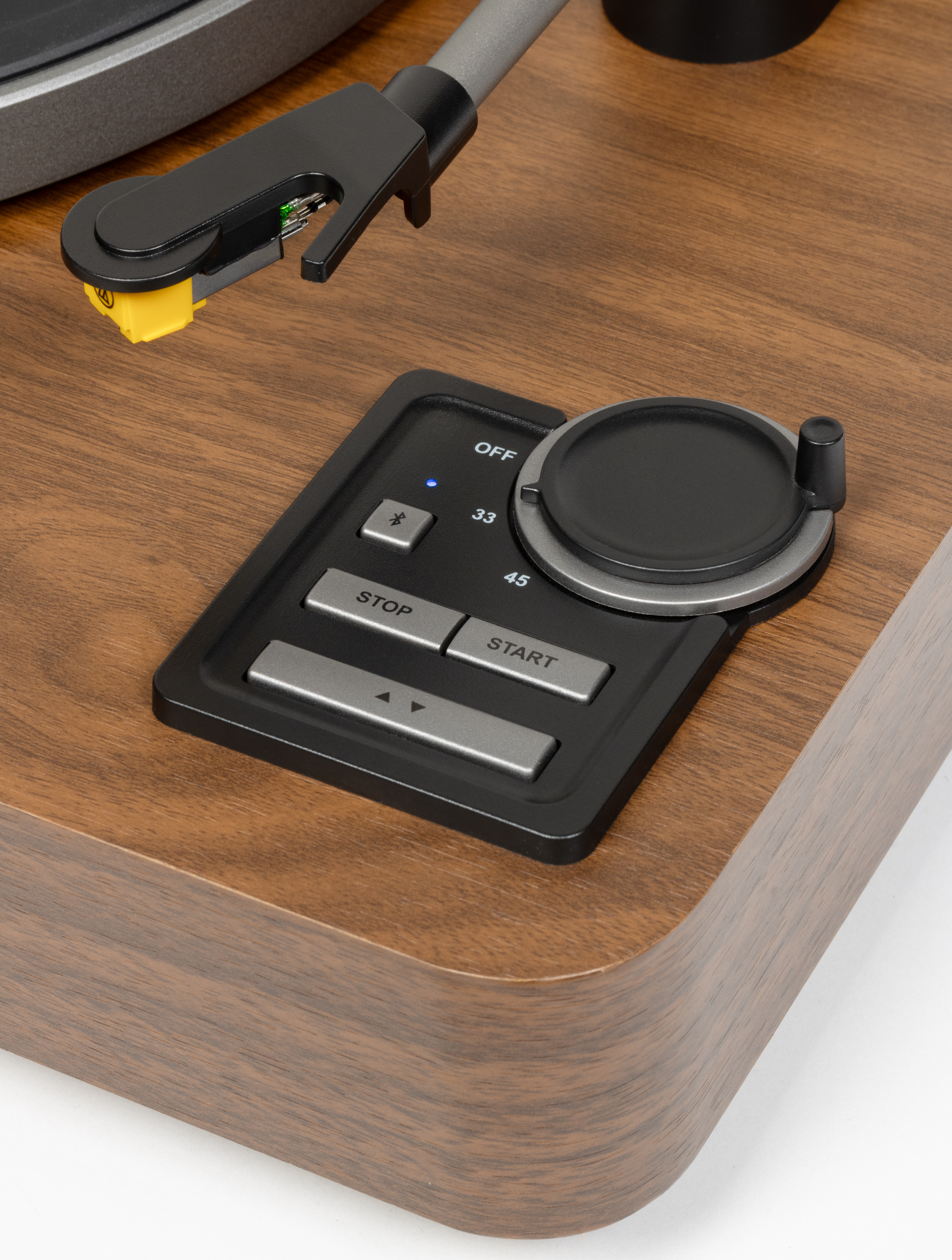 Ниже расположена сдвоенная клавиша со стрелками — с ее помощью можно поднять или опустить тонарм в любом месте записи. Удобно, если хочется послушать конкретный фрагмент пластинки. При этом, если поднять тонарм над его стойкой, диск вращаться не будет. Но стоит сдвинуть его ближе к центру — и вращение начнется. Причем это работает как при управлении кнопками, так и при ручном перемещении тонарма.