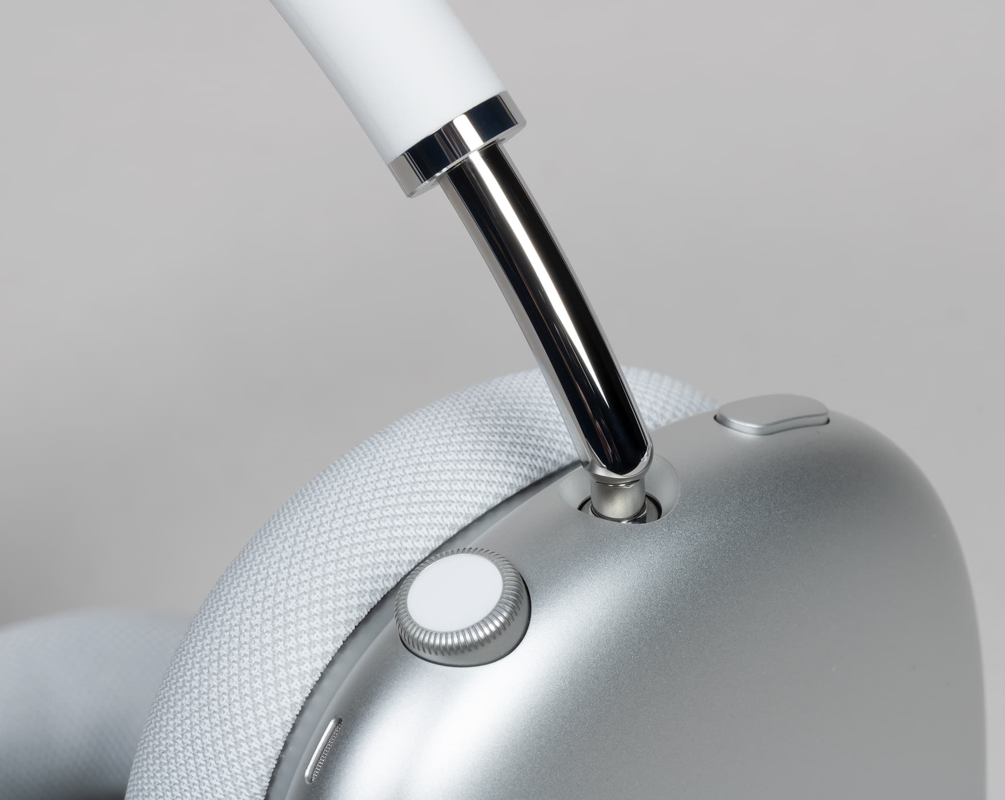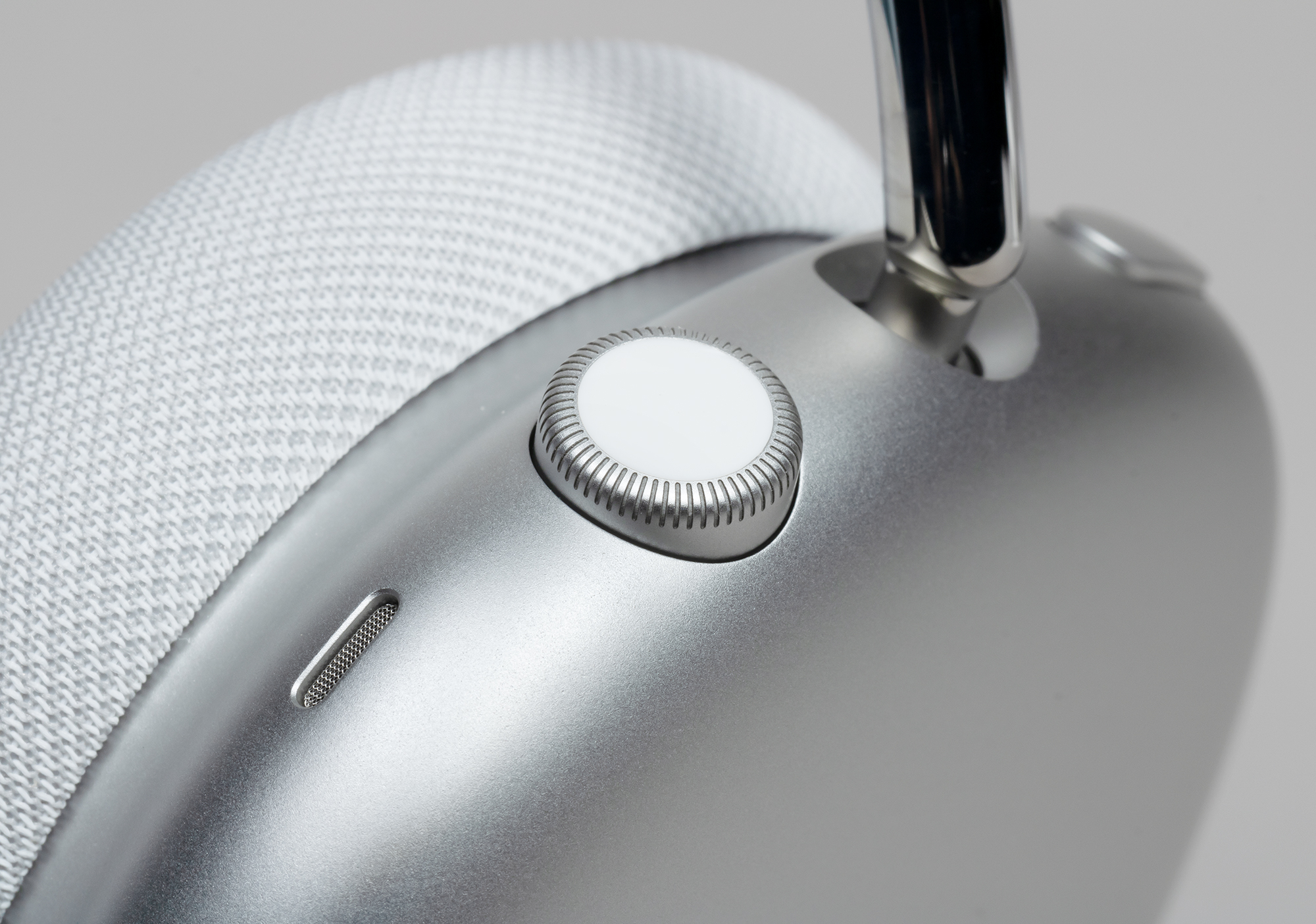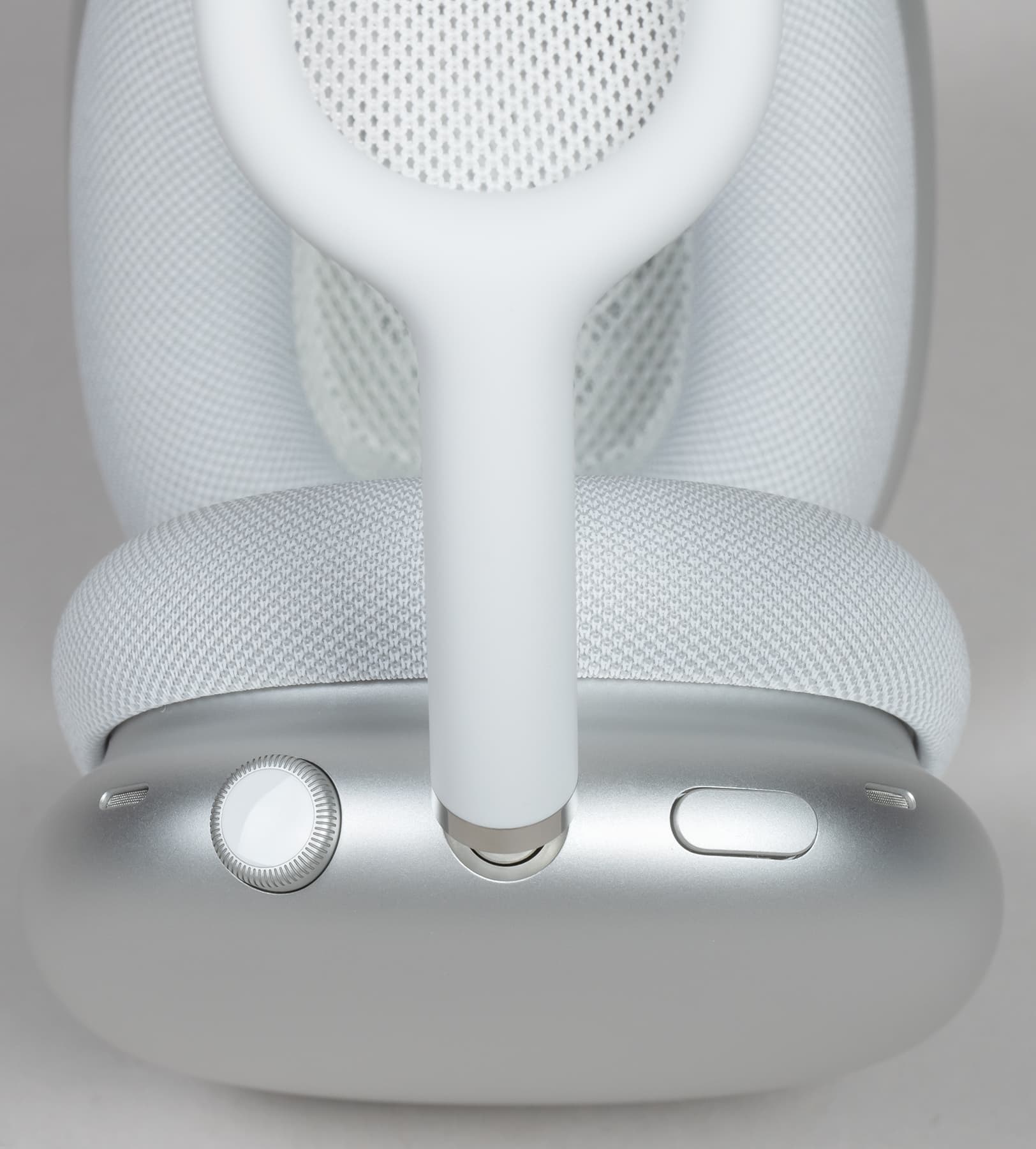 Конечно, самая прямая ассоциация здесь — часы Apple Watch. То же сочетание серебристого алюминия и белого силикона. Но дело даже не только в этом. Основные элементы управления AirPods Max тоже позаимствованы у Apple Watch. Это колесико Digital Crown и продолговатая алюминиевая кнопка.