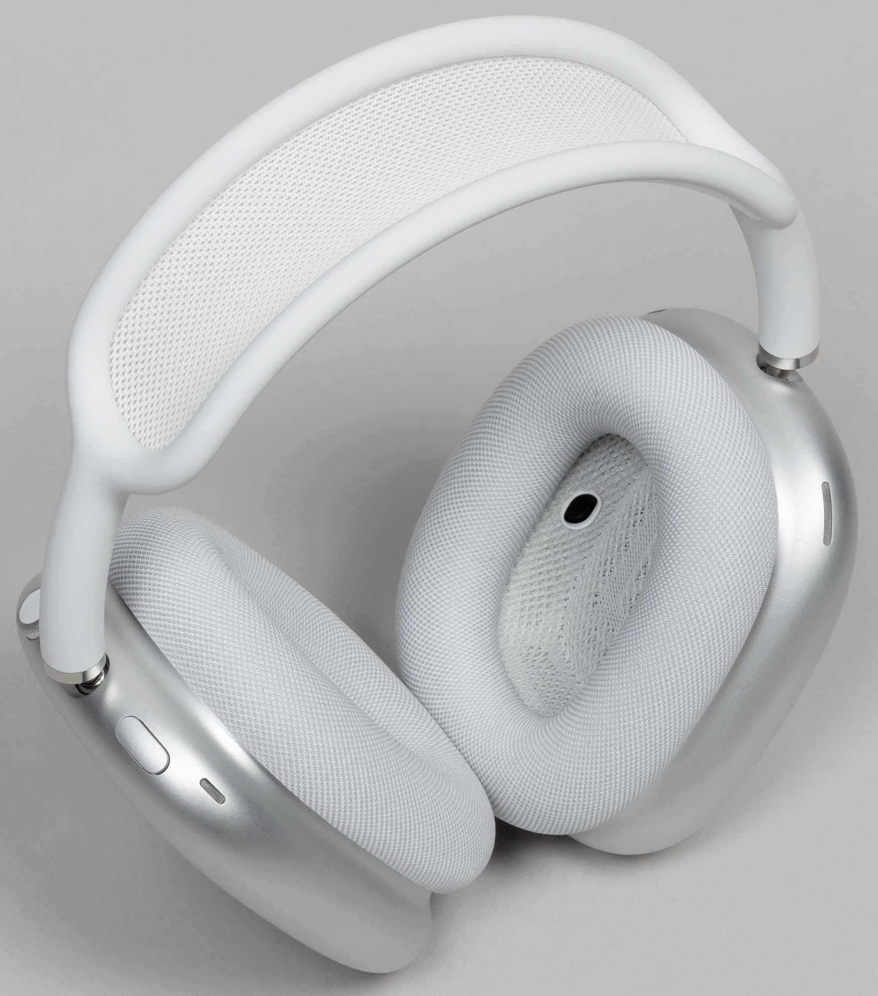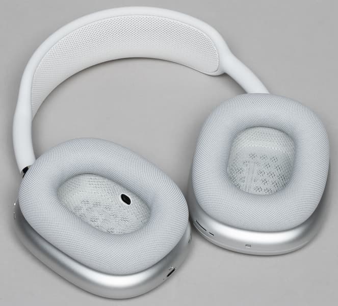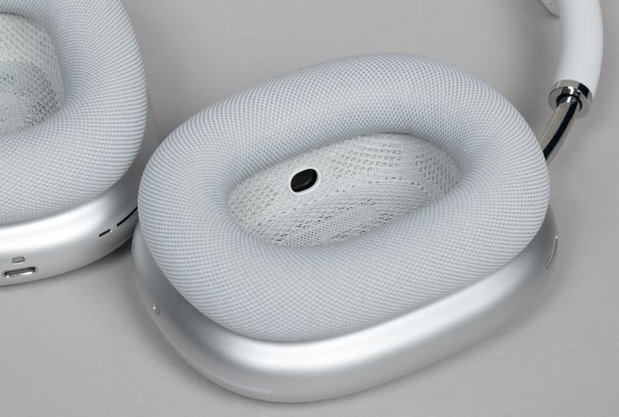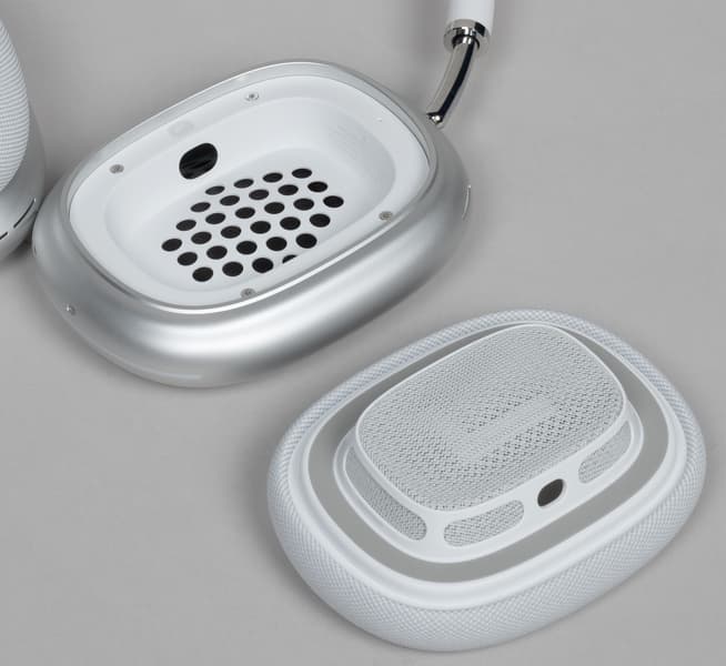 Амбушюры выполнены из мягкого материала, который производитель называет «акустически оптимизированным пеноматериалом с эффектом памяти», то есть со временем он приспосабливается к форме головы и ушей конкретного пользователя и ложится оптимальным образом. Сверху амбушюры и динамики покрывает сетчатая ткань. На фото ниже виден также микрофон, задача которого — улавливать и оценивать (передавая на процессор Apple H1) звуки вблизи уха пользователя. Такой же микрофон есть и в другом наушнике.