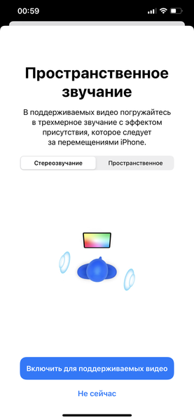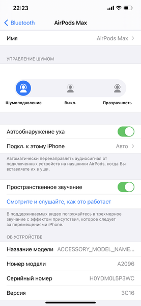 Поскольку в чехле, в отличие от предыдущих AirPods, аккумулятора нет, то процент заряда показывается только у самих наушников. Настройки в разделе Bluetooth на iOS — такие же, как у AirPods Pro (в частности, речь о настройках шумоподавления), но обратим внимание на опцию пространственного звучания. В принципе, в актуальной версии ПО она поддерживается и на AirPods Pro, но, конечно, в накладных наушниках это уже совсем иное. Давайте остановимся на этом поподробнее.