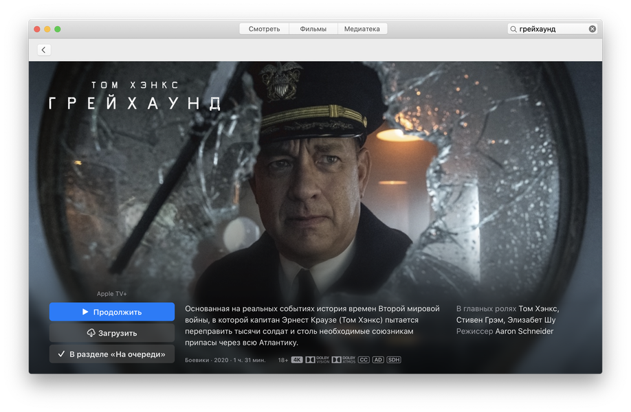 Эта функция позволяет программным образом имитировать многоканальное звучание. Причем если вы поворачиваете голову во время просмотра или поворачиваете iPhone/iPad, на котором воспроизводится фильм, то звук следует за вами. Пока это работает только в приложении Apple TV и только на мобильных устройствах с iOS 14 / iPadOS 14. Почему нет поддержки macOS — большой вопрос, ведь очевидно, что фильмы лучше смотреть на экране iMac или MacBook. Кроме того, сам контент должен поддерживать многоканальность: у фильма должна быть дорожка 5.1, 7.1 или Dolby Atmos. Мы проверили, как это работает, на картинах «Грейхаунд» (военно-морская драма, эксклюзив Apple TV+ с Томом Хэнксом в главной роли), «Безумный Макс: Дорога ярости» и «Крошечный мир» (замечательный документальный сериал Apple TV+). У всех у них аудиодорожка Dolby Atmos.