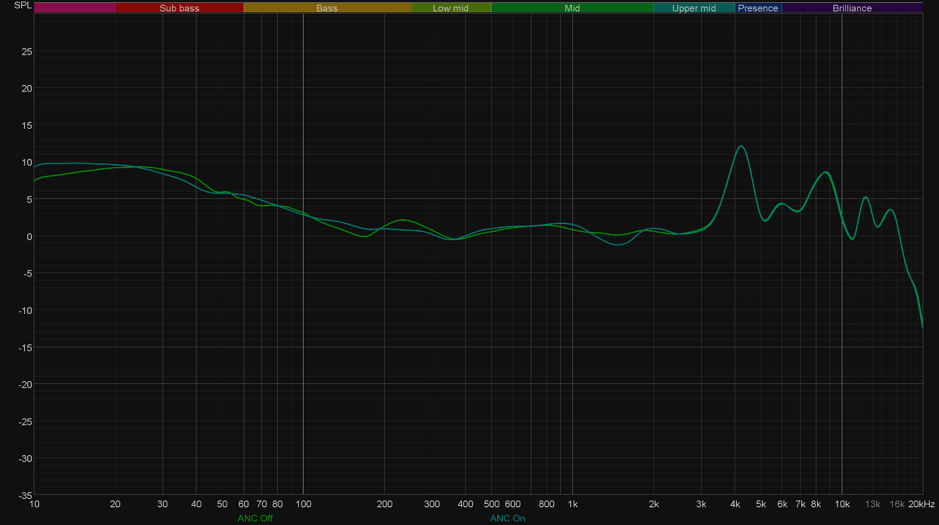 Как видно, некоторые изменения есть, но они крайне невелики. Не наблюдается даже часто встречаемого «проседания» низкочастотного диапазона, а середина и вовсе становится немного ровнее. При этом субъективно она чуть теряет в детализации, но чувствуется это не очень остро и не во всех треках, так что всерьез говорить об этом не стоит. Напротив, стоит отметить, что AirPods Max — одни из немногих наушников, у которых можно смело пользоваться системой ANC без опасений потерять в качестве звука.