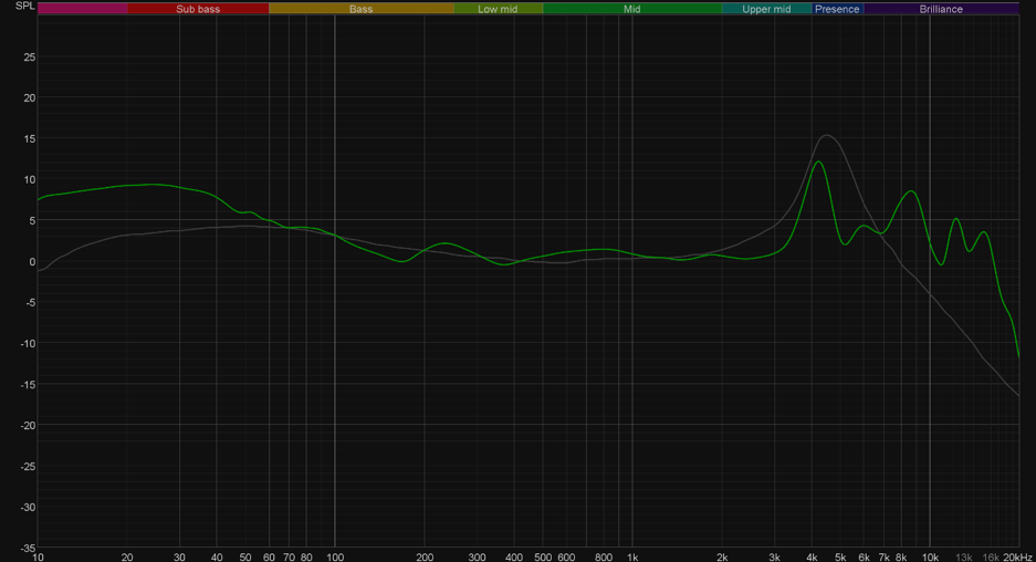 Все, о чем мы говорили выше, заметно и на графике: основательно форсированный «глубокий бас», ровная середина… К изрезанности графика в ВЧ-диапазоне мы традиционно не будем относиться слишком серьезно. График АЧХ показан на фоне кривой HEQ (headphone compensation for flat EQ target), предоставленной производителем используемого стенда. Задача кривой — помочь скомпенсировать резонансные явления в имитированном ухе и особенности оборудования, создав «звуковой профиль», максимально корректно иллюстрирующий то, как звучание наушников воспринимается слушателем. Ее можно рассматривать как адаптированный под конкретное устройство аналог так называемой «кривой Хармана», созданной командой Harman International под руководством доктора Шона Олива. Скомпенсируем полученный график АЧХ в соответствии с кривой HEQ.