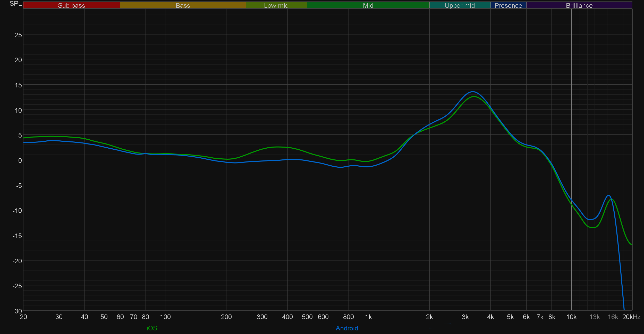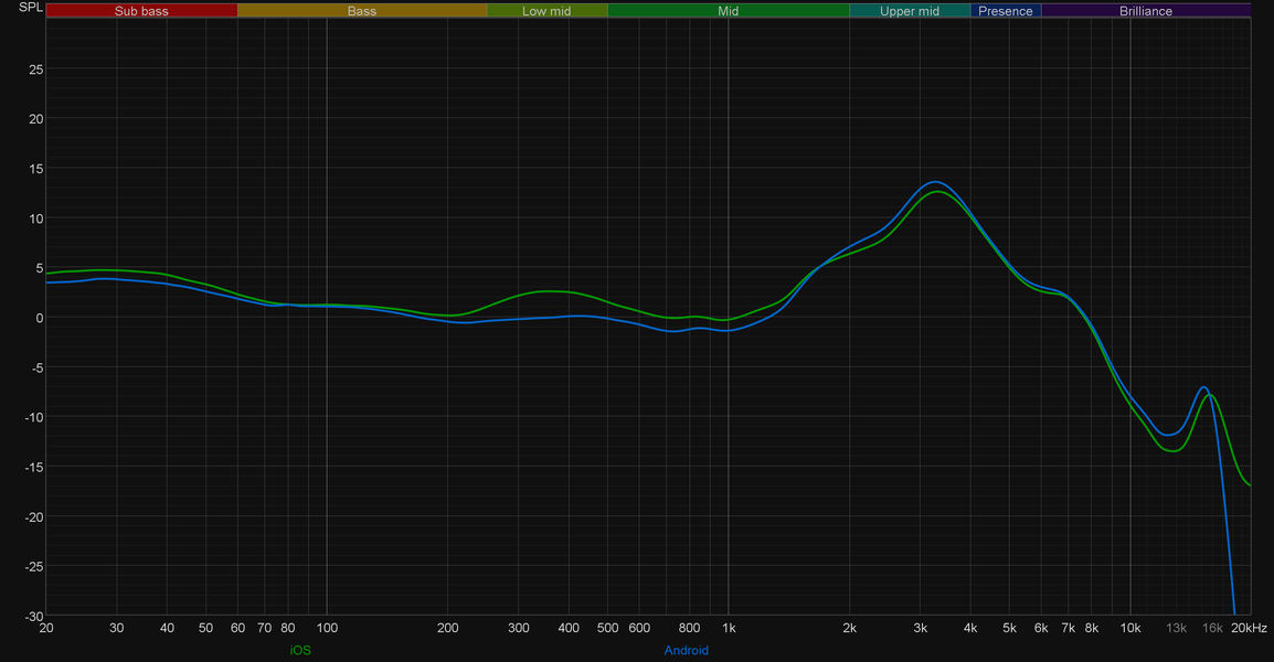 Как и было сказано в посвященном кодекам обзоре, при трансляции сигнала с Android-смартфона частоты выше 16 кГц обрезаются. А вот при подключении к смартфону под iOS этого эффекта нет. В общем, не хотелось бы делать слишком радикальных выводов, но всё же получается, что при использовании устройства Apple звучание становится немножко более качественным.