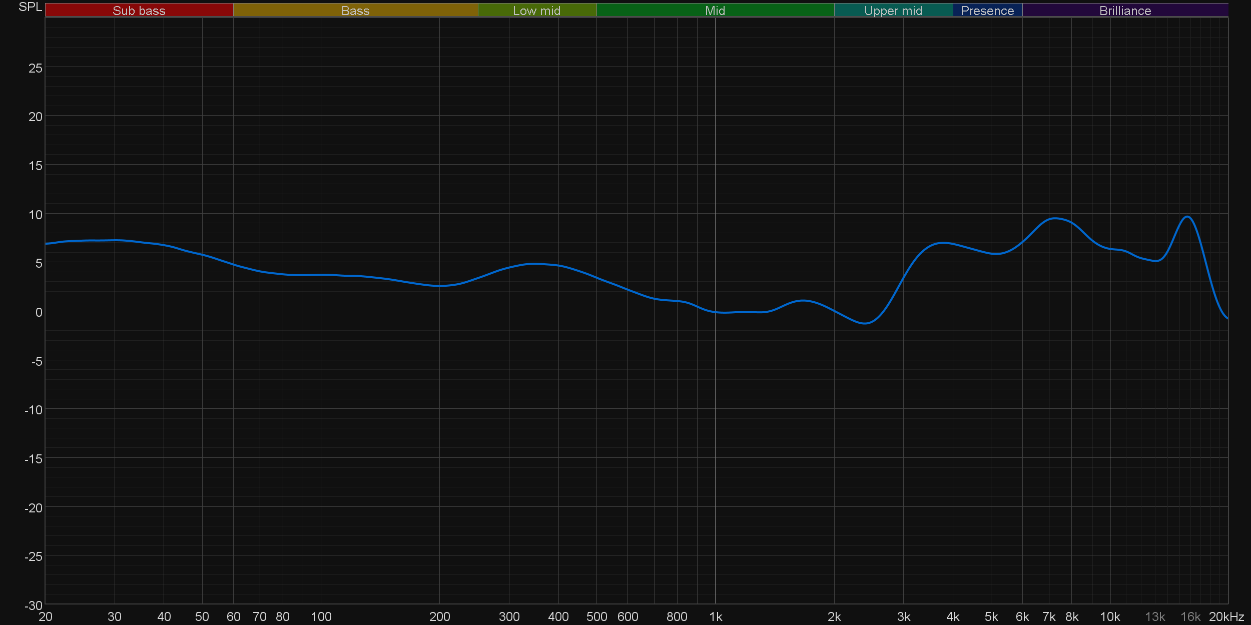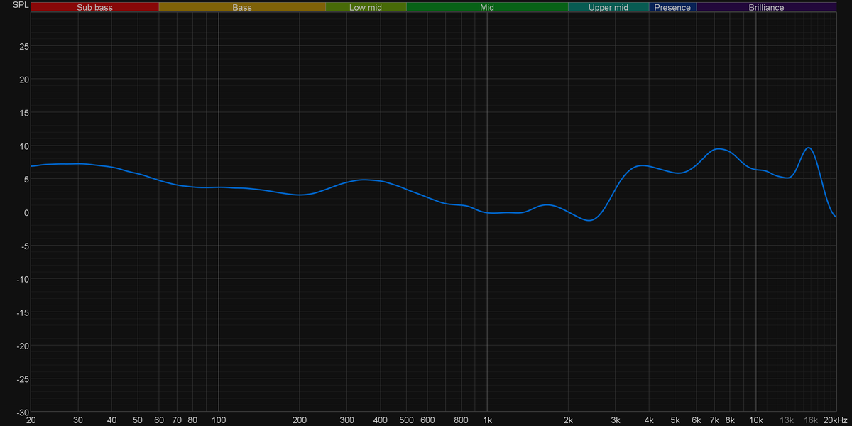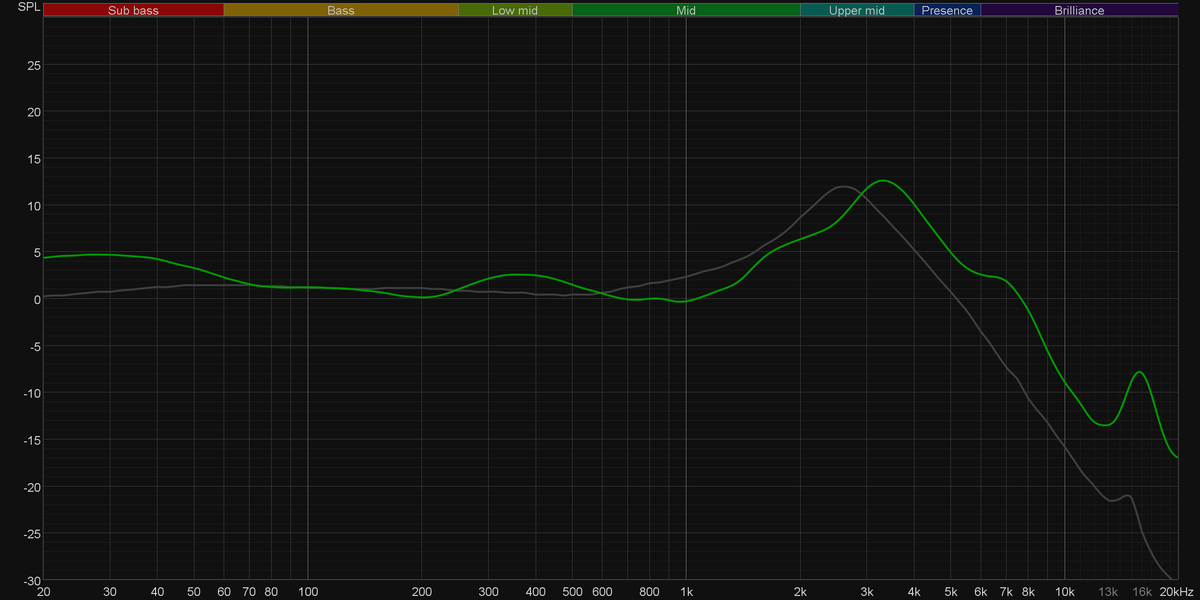 График АЧХ показан на фоне кривой IDF (IEM diffuse field compensation), предоставленной производителем используемого стенда. Ее задача — помочь скомпенсировать резонансные явления в имитированном слуховом канале и особенности оборудования, создав «звуковой профиль», максимально корректно иллюстрирующий то, как звучание наушников воспринимается слушателем. Ее можно рассматривать как адаптированный под конкретное устройство аналог так называемой «кривой Хармана», созданной командой Harman International под руководством доктора Шона Олива. Скомпенсируем полученный график АЧХ в соответствии с кривой IDF.