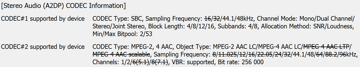 Настройка на этом закончена, осталось поговорить про поддерживаемые кодеки. Их полный список мы традиционно получили с помощью утилиты Bluetooth Tweaker.
