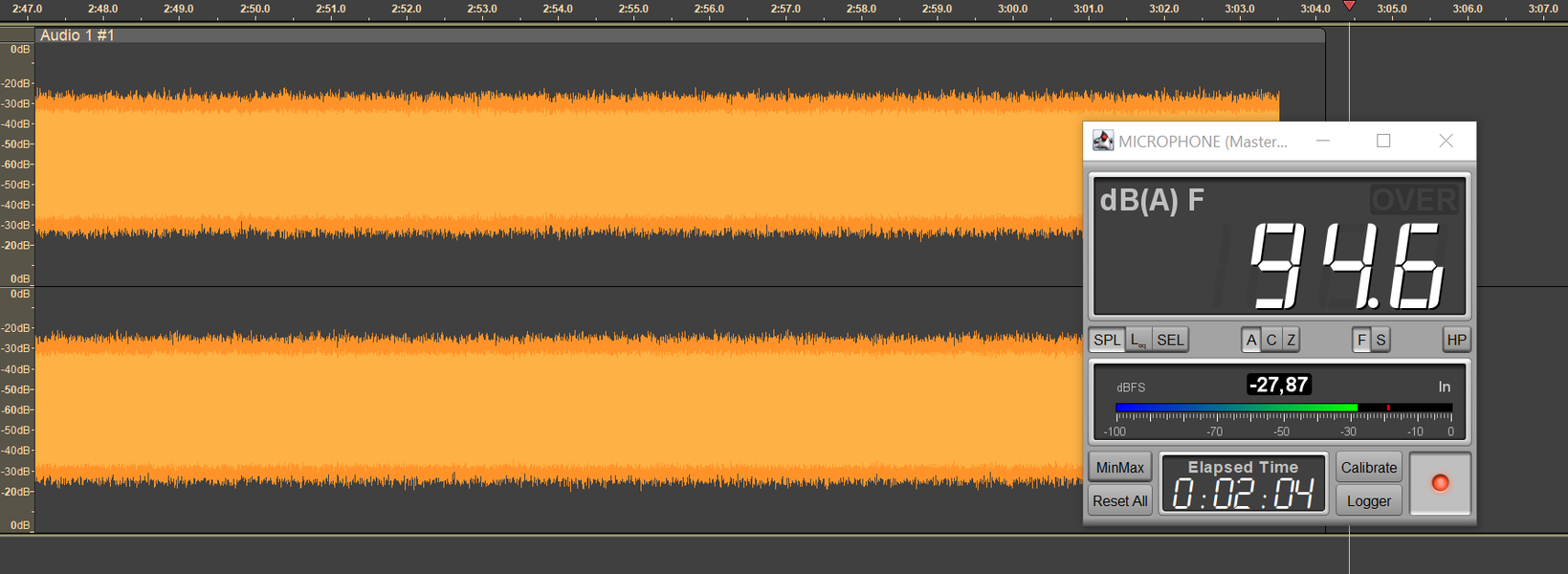 Проверим наше предположение на практике. Ниже размещены два трека. На первом речь записана с помощью микрофонов гарнитуры. Второй записан на расположенный примерно на том же расстоянии профессиональный рекордер с заведомо высоким качеством записи и приводится для сравнения.