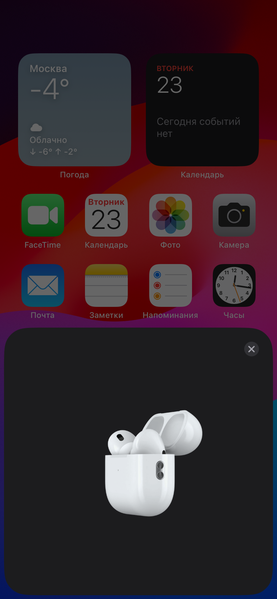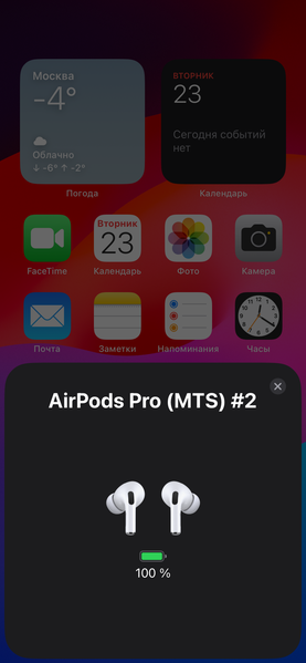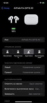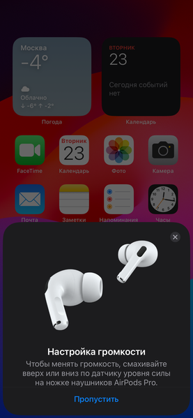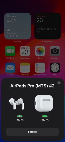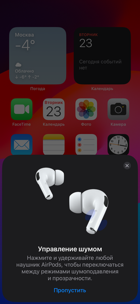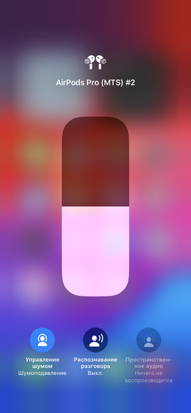 Как уже упоминалось выше, для работы AirPods Pro с устройствами Apple не требуется установки специального ПО, всё необходимое уже есть в iOS. При открытии крышки кейса появляется «всплывающее» окно, демонстрирующее уровень зарядки футляра и наушников. Все основные действия с гарнитурой можно осуществлять через модуль, вызываемый из «шторки». В частности, из него настраиваются режимы шумоподавления и «звуковой прозрачности». В первом случае система подавляет окружающие звука, во втором — напротив, транслирует их в динамики гарнитуры, давая пользователю возможность услышать какое-нибудь объявление, ответить на вопрос прохожего и так далее.