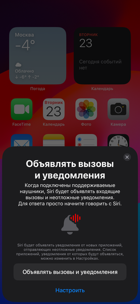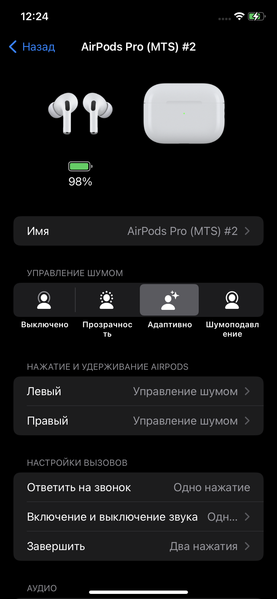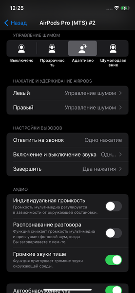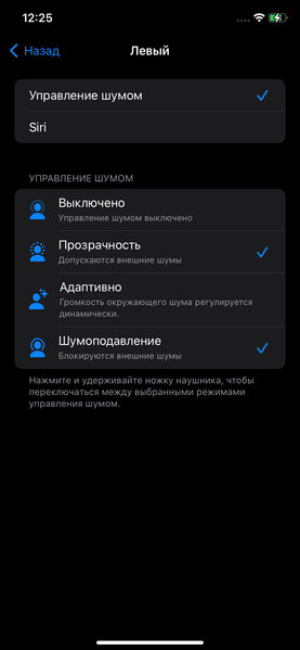Больше различных вариантов настроек собрано на вкладке гарнитуры в меню настроек. Можно задать имя устройства, активировать один из вариантов работы «шумодава». И даже слегка изменить профиль управления, в частности — выбрать, что будет делать длительное нажатие сенсорной зоны. При этом гарнитура умеет отличать правый наушник от левого — на один можно «повесить» смену выбранных режимов, на другой — активацию голосового ассистента Siri, с помощью которого потом можно и трек сменить, и позвонить кому-нибудь... Хотя нам в ходе тестирования оказалось проще и удобнее делать это голосом.