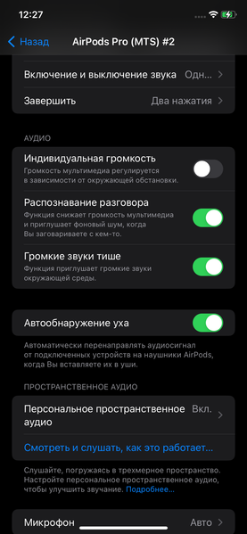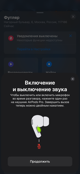 После подключения наушников система периодически напоминает о всяческих полезных «фишках», появившихся сравнительно недавно. Вот, например, мы совсем забыли упомянуть о том, что с обновлением до iOS 17 появилась возможность отключать микрофон гарнитуры, которая может быть очень полезной во время различных онлайн-конференций.