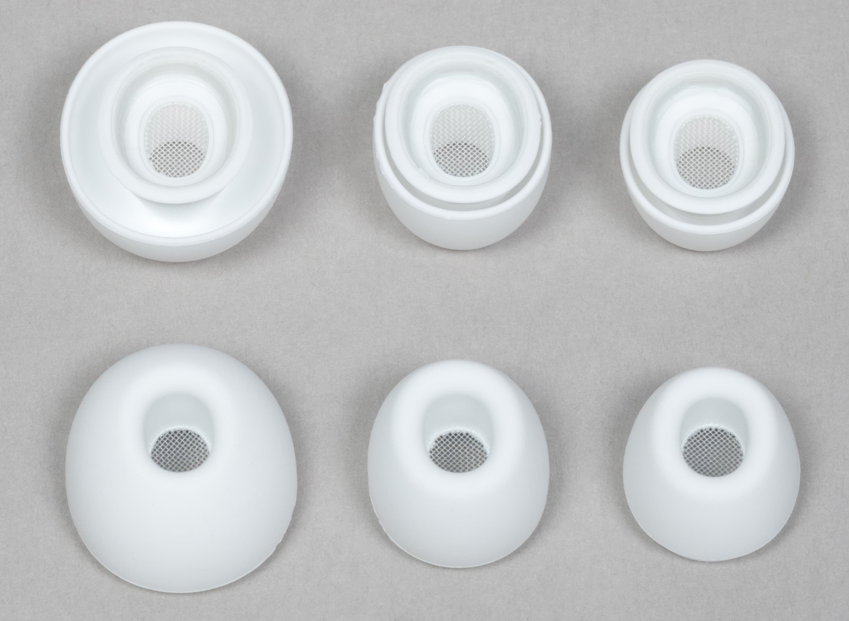 Комплекта силиконовых насадок четыре, можно подобрать удобные обладателям как очень маленьких, так и крупных ушей. Средние (М) установлены по умолчанию, остальные (XS, S и L) поставляются в удобном картонном холдере. Выполнены они из приятного мягкого силикона и оснащены собственной сеточкой, предотвращающей загрязнение звуковода наушников.