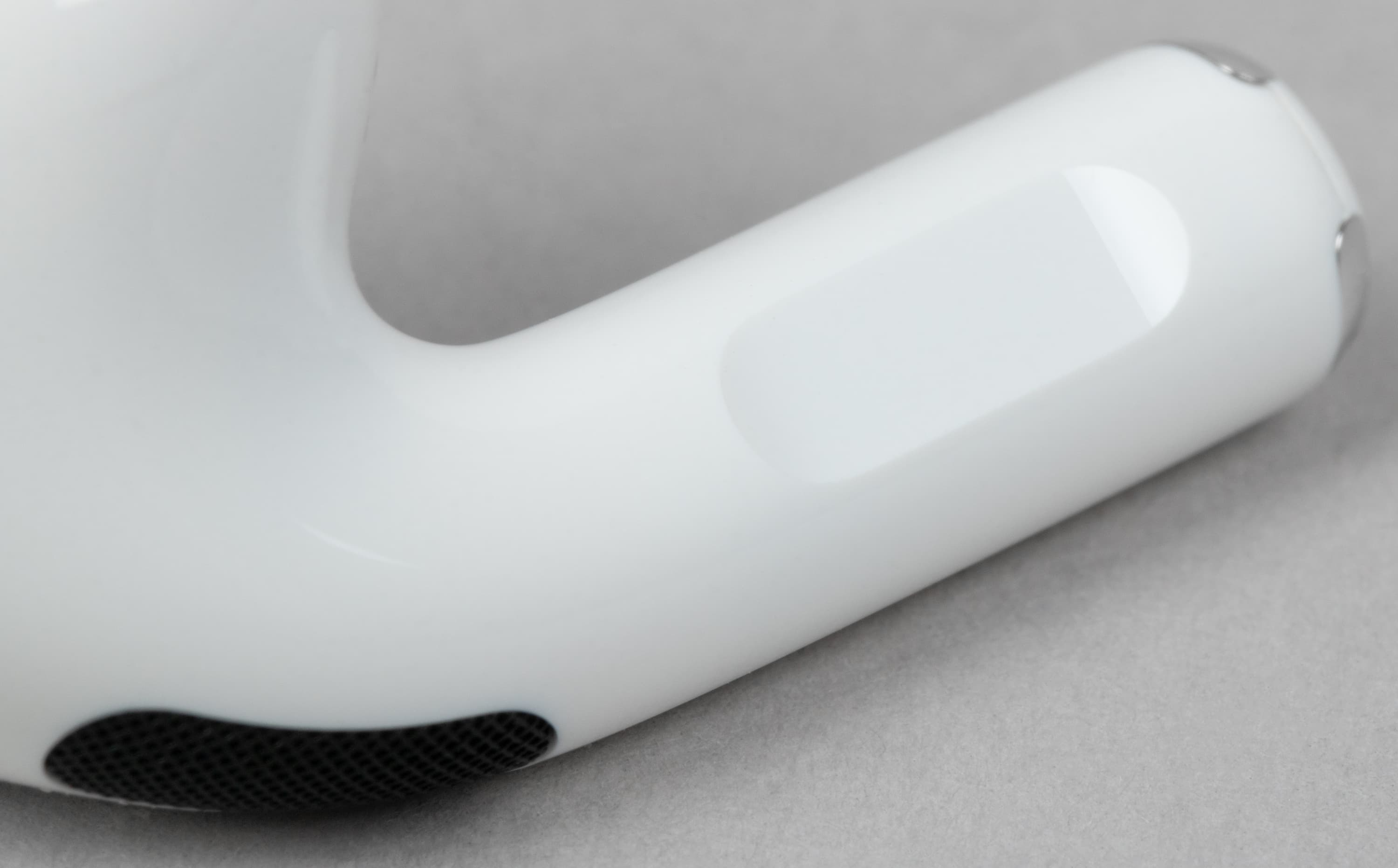 Наушники тоже выполнены из глянцевого белого пластика, на боковой поверхности «палочек» размещена сенсорная зона, подчеркнутая с помощью небольшого углубления — к ней мы еще вернемся.