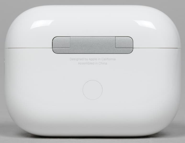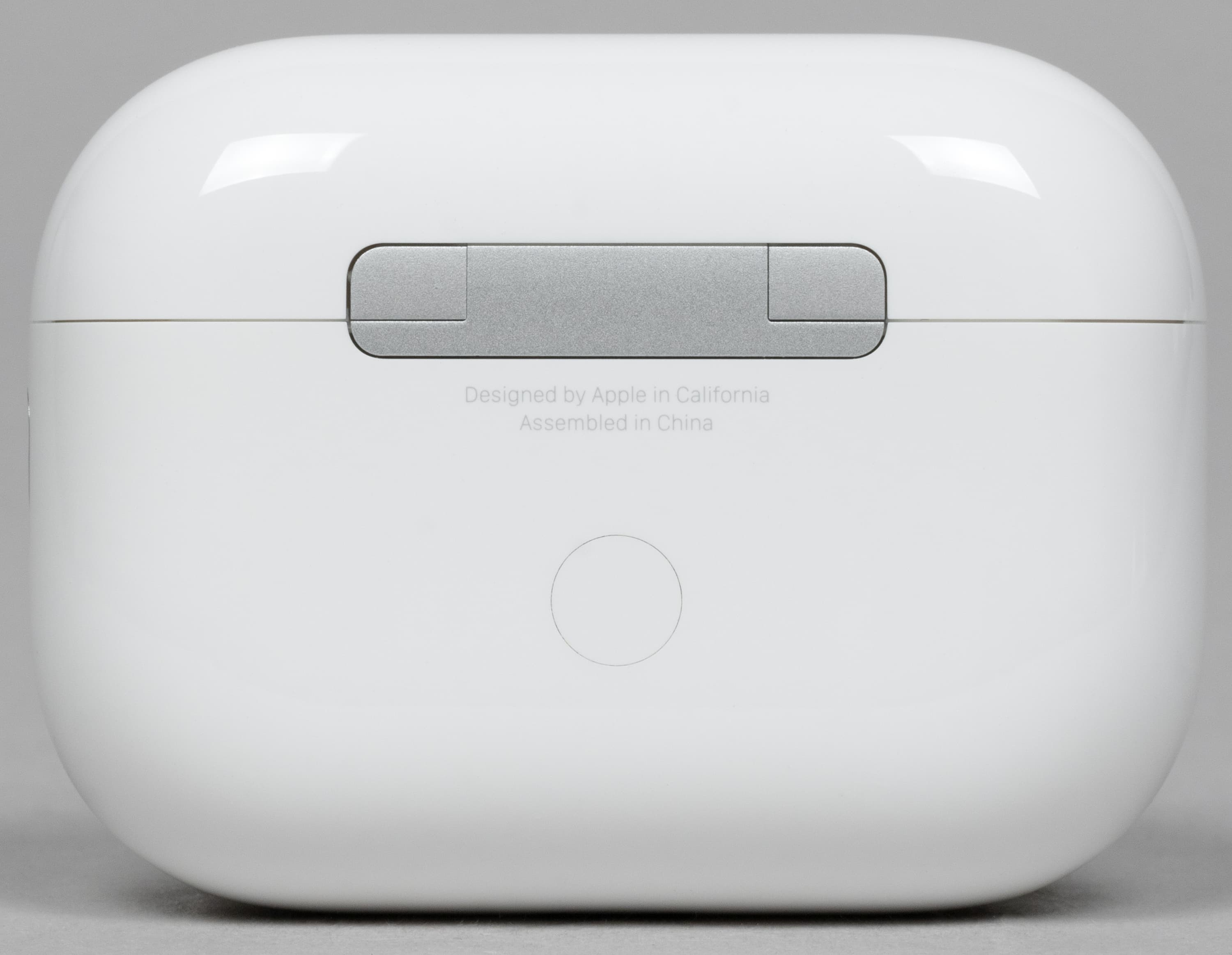На задней панели мы видим стандартную надпись «разработано в Калифорнии — сделано в Китае». Под ней находится едва заметная кнопка, позволяющая вручную активировать режим сопряжения. Обеспечивающая движение крышки петля выполнена из металла.