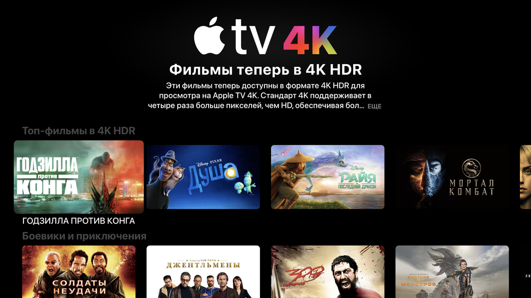 В приложении Apple TV (да, оно называется так же, как приставка, поэтому здесь небольшая путаница) есть специальный раздел с фильмами 4К HDR. И там уже очень много наименований — во много раз больше, чем было, когда мы тестировали прошлую модель.