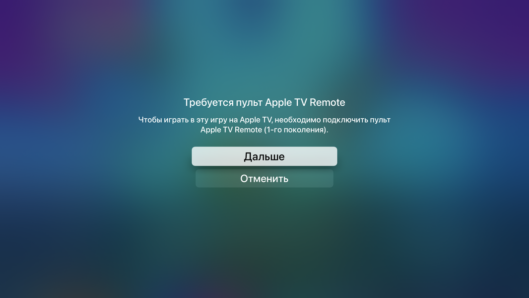 Эта надпись может ввести в заблуждение, ведь у нас-то теперь пульт Apple TV Remote не первого поколения! Или же предыдущий пульт ДУ назывался как-то иначе? Но, впрочем, с новым пультом все прекрасно работает. Так что просто жмем «Дальше» и спокойно играем.