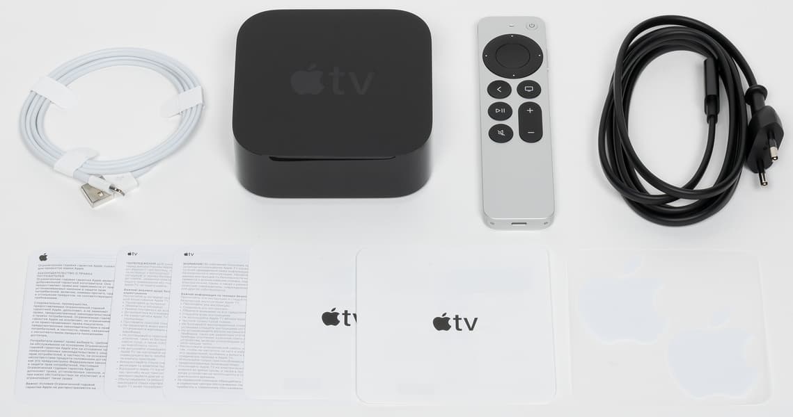 Внутри мы видим само устройство, сетевой кабель, руководства пользователя, фирменный пульт ДУ и кабель Lightning.