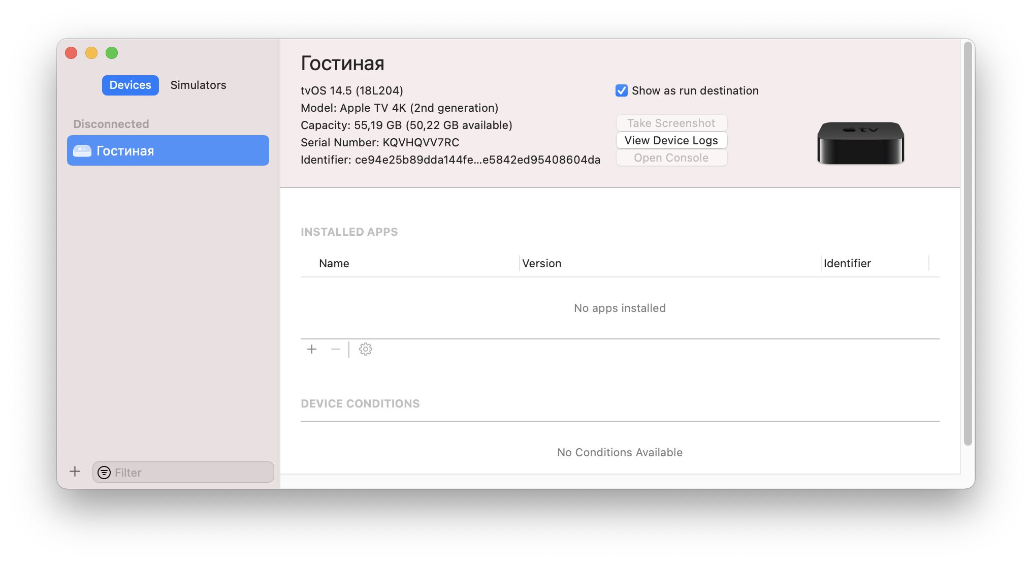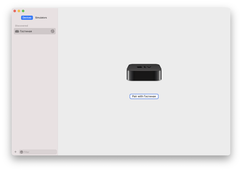 Для того, чтобы подсоединить Mac к Apple TV и снимать скриншоты, необходимо установить на компьютер под управлением macOS Big Sur новейшую версию пакета средств разработки Xcode, затем подключить Mac к той же Wi-Fi-сети, в которой Apple TV, открыть в Xcode вкладку Window / Devices and Simulators, выбрать среди доступных устройств Apple TV и нажать Pair with [название вашего Apple TV].