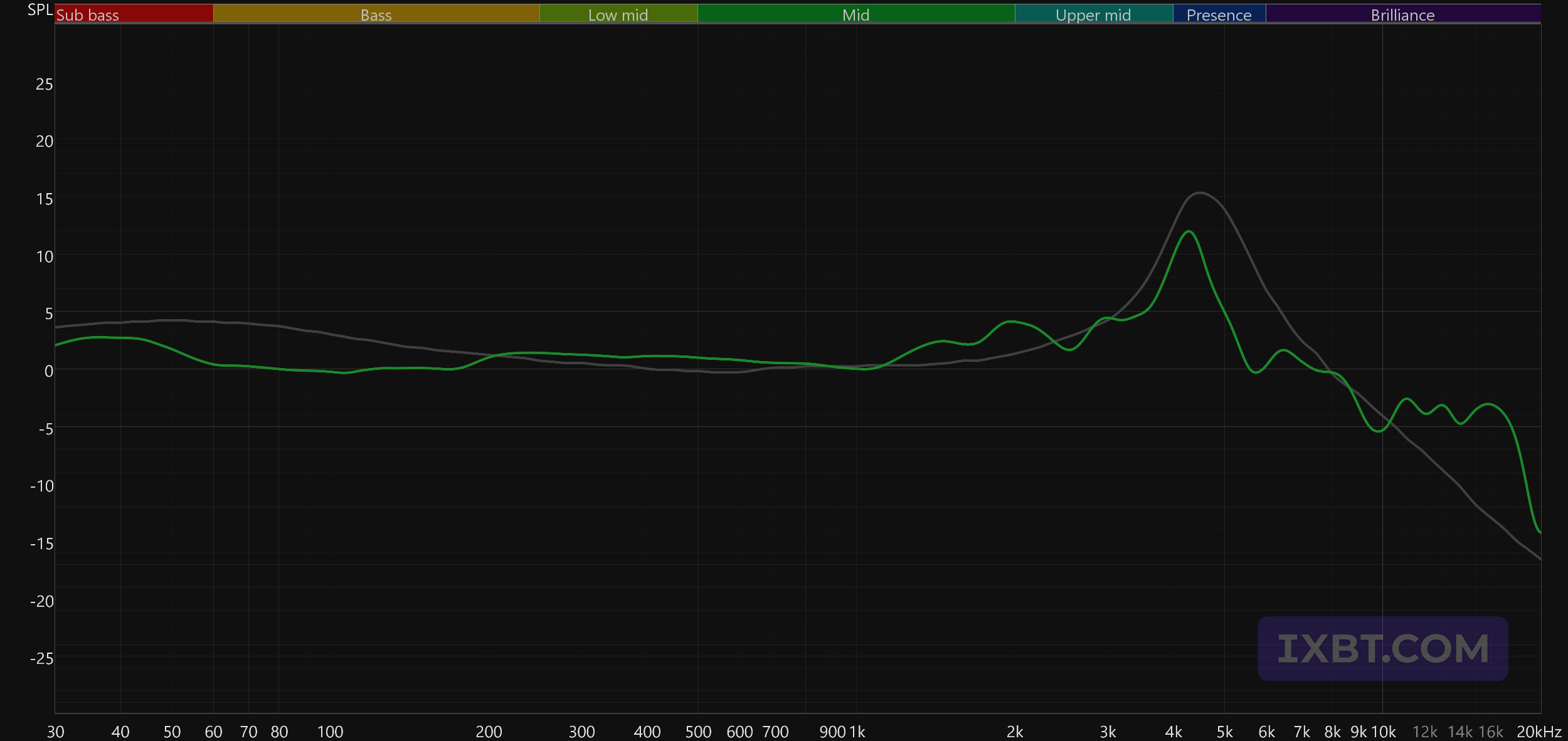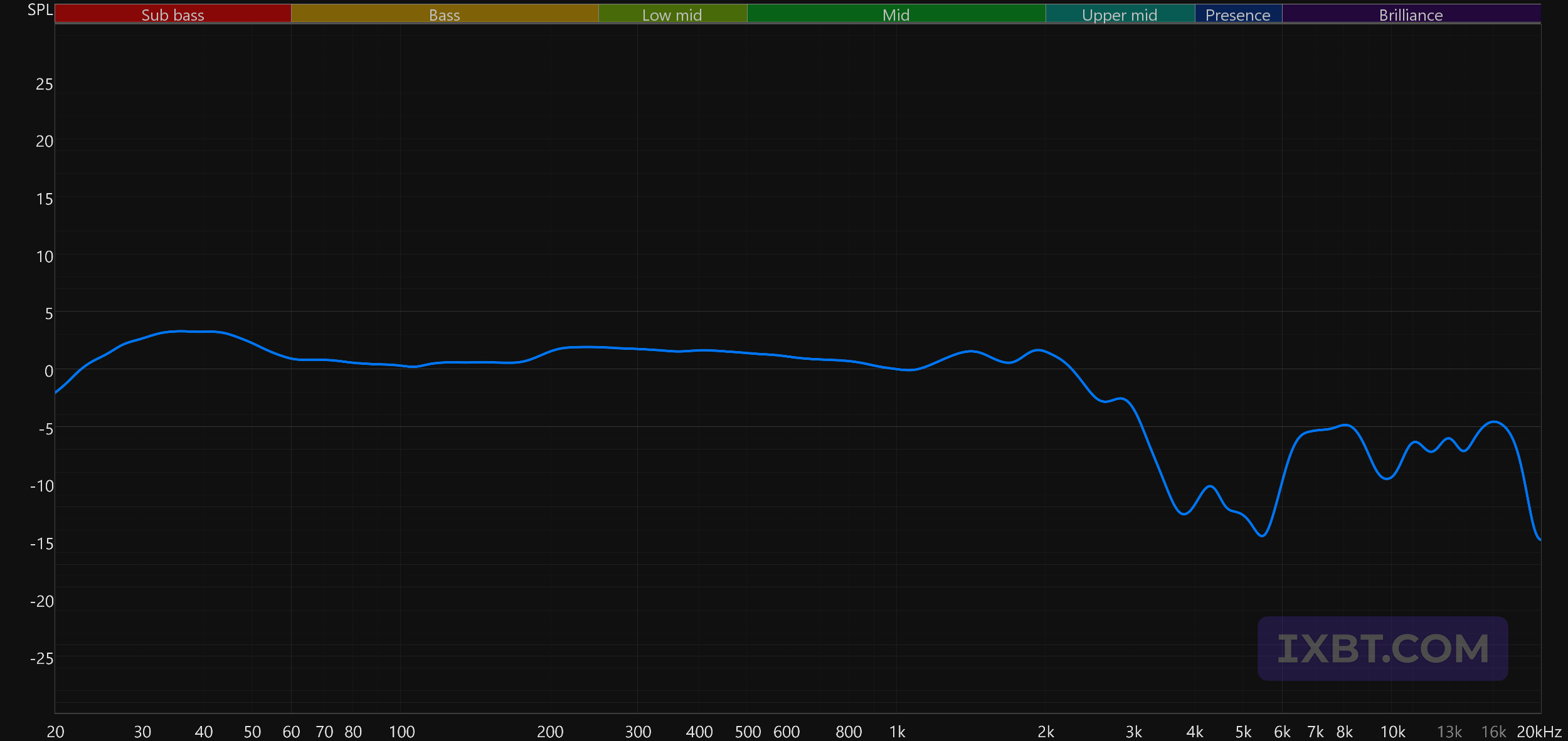 Тональный баланс предсказуемо сбалансирован: наушники выдают практически ровное и «мониторное» звучание со своими интересными особенностями, что хорошо видно по сходству с целевой кривой. Глубокий бас немного акцентирован, но заметно это будет лишь в треках, где его много — танцевальной музыке, хип-хопе и так далее. Там подобный акцент звучит вполне уместно. НЧ-регистр подается сдержанно, но крайне плотно и собранно, без намеков на гудение и бубнение — технология SLAM действительно делает свое дело. Диапазон примерно 200—1000 Гц при этом чуть выдвинут вперед: не настолько, чтобы сделать бас нечитаемым, но достаточно, чтобы подчеркнуть детальность середины — пожалуй, одну из главных сильных сторон планарно-магнитных излучателей.