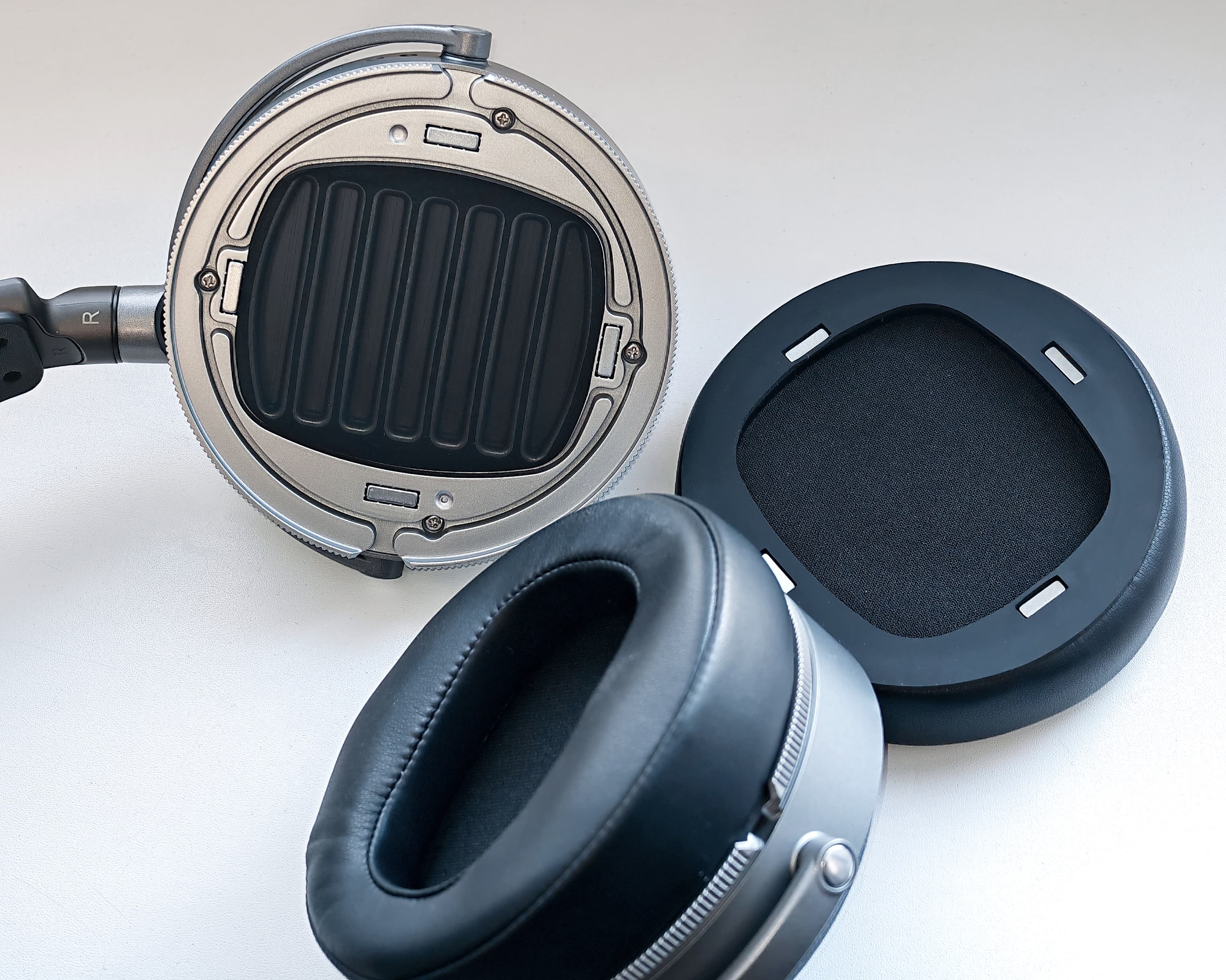 Амбушюры удерживаются магнитными креплениями и легко снимаются — для этого на внешнем ободе предусмотрено специальное отверстие, за которое удобно зацепиться пальцем. Полярность магнитов подобрана так, чтобы крепление происходило только в правильном положении.