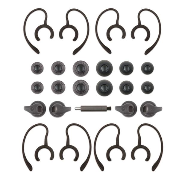 Наушники собираются из нескольких сменных комплектующих. Это позволяет максимально подстроиться под индивидуальные особенности и предпочтения пользователя. Кстати, изогнутую дужку для крепления за ухом надевать вовсе не обязательно. Она пригодится, только если наушники будут использоваться при активном движении. Есть дужки 2 размеров: стандартные и увеличенные.